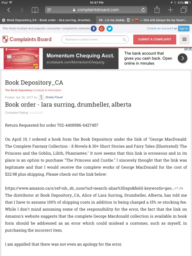 Please refer to attached photo. I am Lara Surring. I reside in Drumheller Alberta Canada. I purchased a book from The Book Depository_CA and am still waiting for the book to arrive. Just on a whim I googled my name and this hit came up of a complaint on this complaints board where my name was being used and I guess I'm being blamed for something that the Book Depository_CA did or didn't do. This is extremely upsetting and invasive. I do not know what your website is about but please let me know if you are able to help correct this in any way. Thank you, Lara
