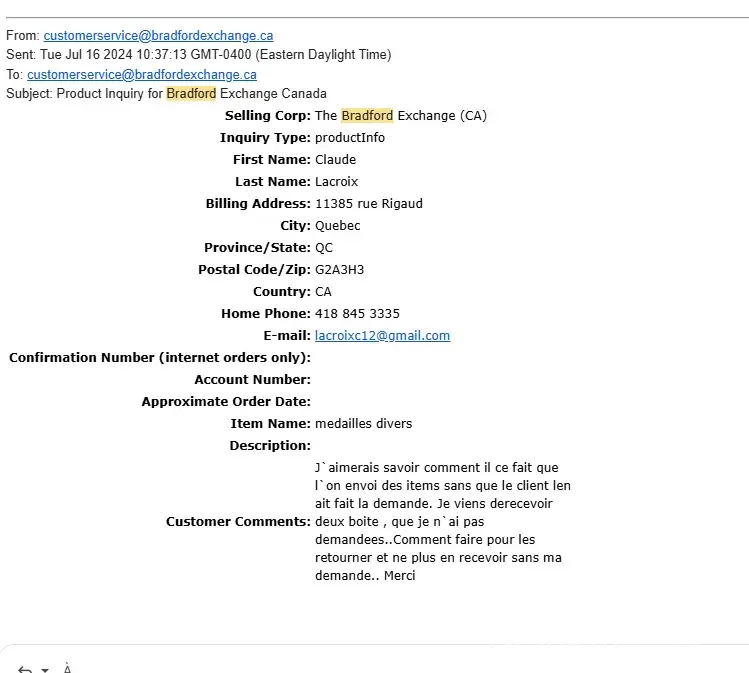 I was frustrated and disappointed with the lack of communication and clarity from BradfordExchange.com. I believe that they should have better customer service people who speak English. It was difficult to understand what they were saying and it made the situation even more stressful.