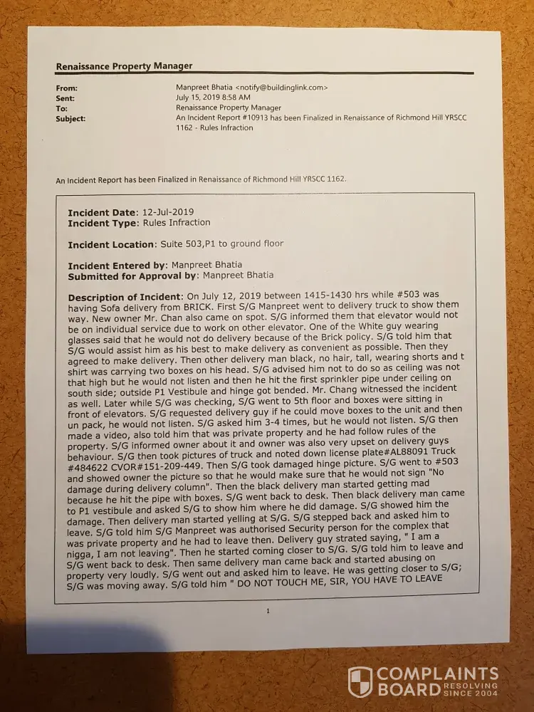 Read full complaintDamage to our condo, plus brick employee forged my initial on the delivery document