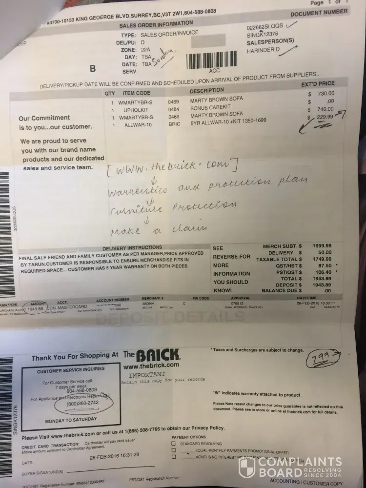 In addition, the sales person Harinder Dhillon then started threatening us by saying that the Brick has a lot of lawyers. We're old and on pension. We just want our sofas fixed as per warranty. We're attaching pictures including of the sales order and sofa.