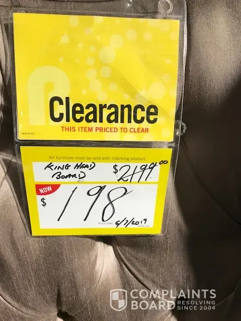UYER BEWARE !!! I visited this location on the evening of June 15, 2019 and saw a headboard that was in the clearance section, it was a good deal ($198.00)but had fabric damage.I returned the next day June 16, 2019 (a.m.) so my wife could see it and to my surprise it had been moved to the main floor and was attached to a bed assembly.I inquired with a...