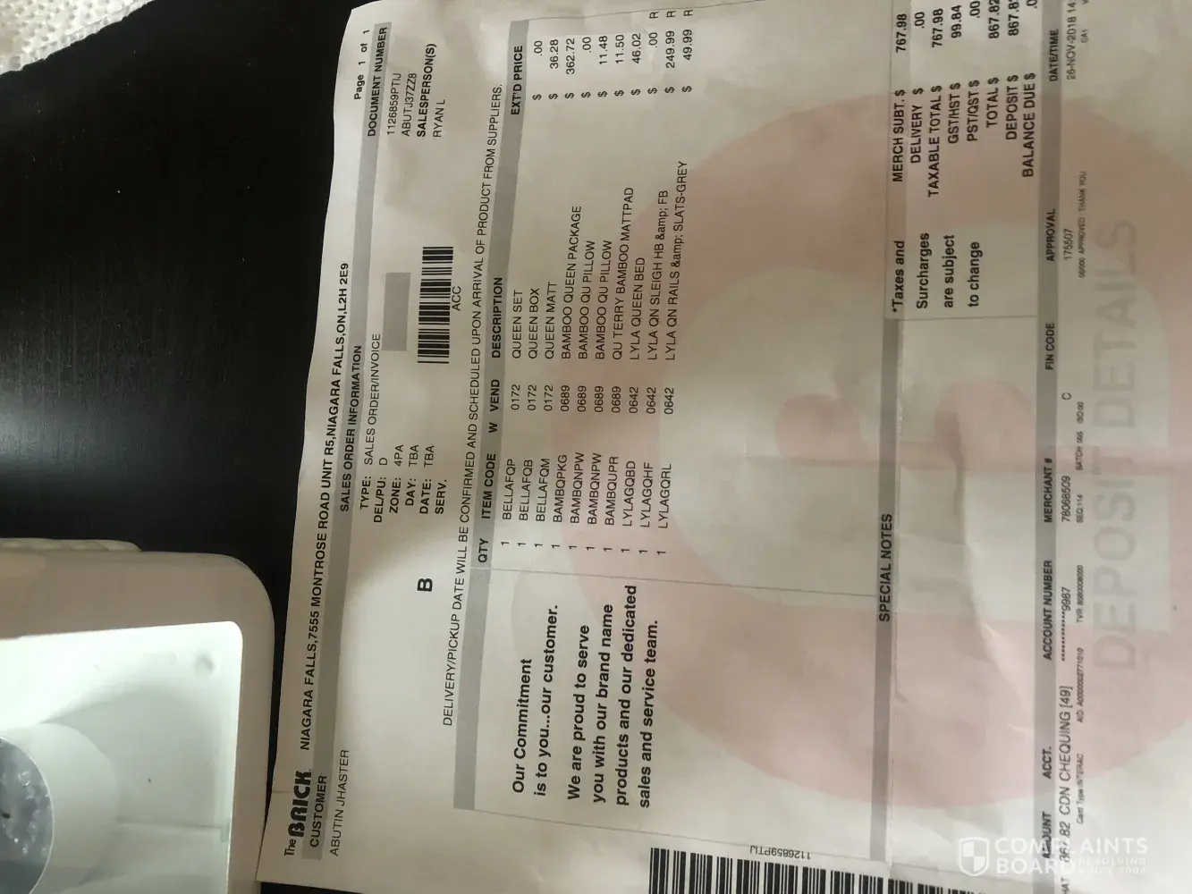 I've ordered a mattress and box spring from the Hinton Alberta Brick store. I was called and advised that the product had arrived. I went there to get it and saw the bottom was punctured so I did not take the product.