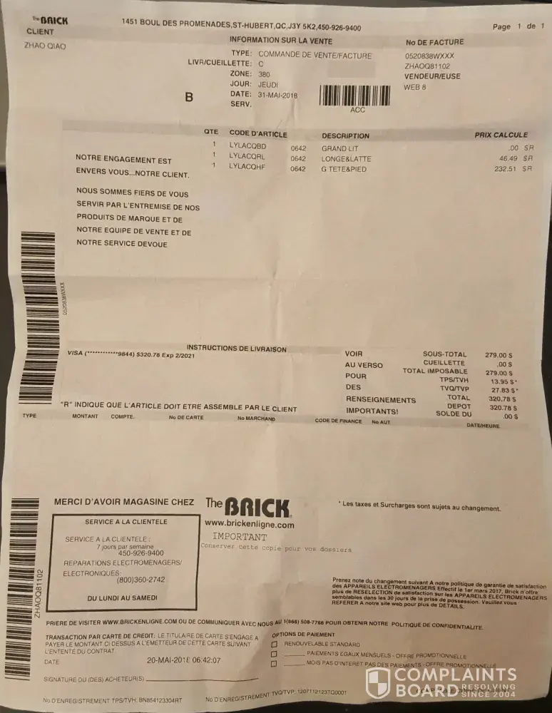 May 1, 2018 is the day I found out about the lies and uninformed information. I had purchased a queen set/mattress on April 09th, 2018 at the Brick outlet on Kennedy Road in Scarborough to have this delivered for May 2nd, 2018. I then later went back to purchase a grey micro love seat which they had added onto one bill on 18th of April, 2018. This then changed everything. I called on May 1, 2018 to check for confirmation delivery date because they had not informed me of anything. I was also never told that the couch that I had purchased was out of stock. The purchase of the couch also pushed the delivery date of the mattress back which is just unreasonable. Because the first time, I had purchased the mattress, the salesman said that if I make the full amount for the mattress before the 20th, I would be able to get the mattress by the 1st of May. So now, because of this delay, I have to spend extra money to purchase a surface to sleep on in the mean time. I had also taken a day off just for this move. For the sales person to not have mentioned anything is just ridiculous. I was even looking forward to purchasing more items but now, they have lost me as a customer. On the invoice, it says "Our commitment is to you...our customer". The Brick Outlet in Scarborough definitely does not go by that. So I have to suffer because of the mistake made on their behalf...never going back ever again.