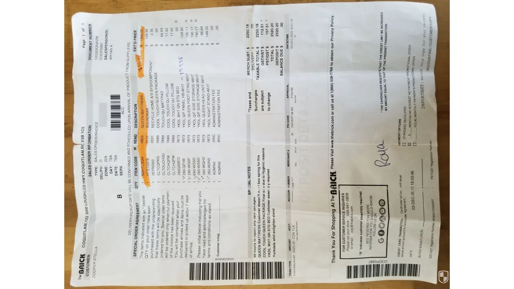 After all of this hassle and after the pick up and delivery was made we followed up with The Brick to confirm the amount of the “refund”. They informed us that it was $743. This was obviously well shy of what we felt we were owed ($1,455.95). After factoring in the new mattress purchase of $391.95 less the down payment of $39.19 our refund should have been $1,103.20, The store manager informed us that she had to deduct the “free” gift package (which we never asked for) plus she had to charge us for the second delivery of $75.