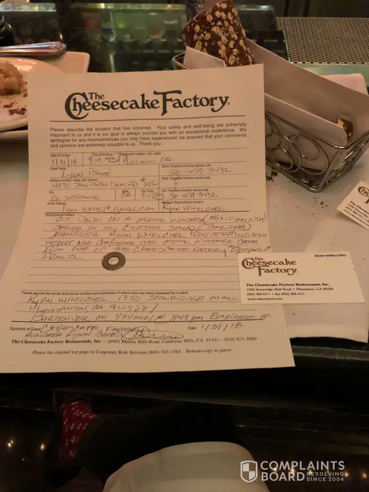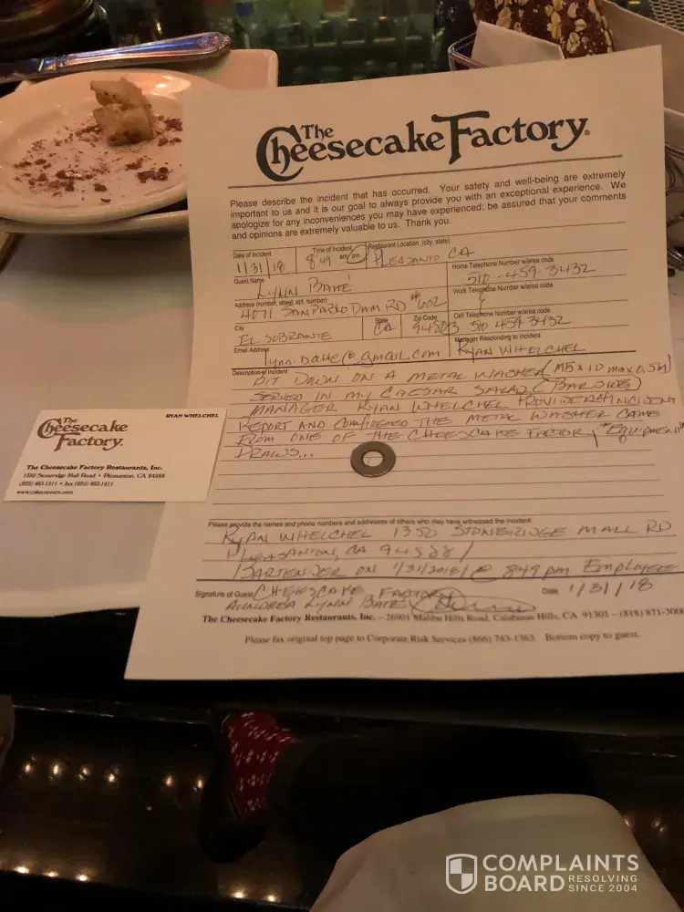 Cheesecake factory Stoneridge Mall (Pleasanton California) Location, I was served a *Metal Washer* in my Caesar Salad...