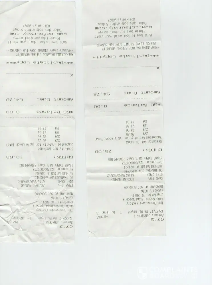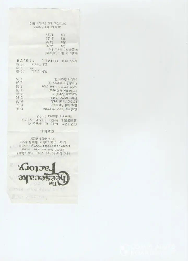 I'm a HUGE fan of their delicious cheesecakes. On this one occasion, I actually got the wrong kind. I ordered 2 pieces of regular caramel cheesecake and got the salted caramel instead. I didn't even notice until I got home. This is an amazing place to eat but I got bummed when I got the wrong flavor. However; this is the first time I've ever had a complaint about the Cheesecake Factory and I'm a regular customer. I hope to get this complaint resolved if possible. 😀