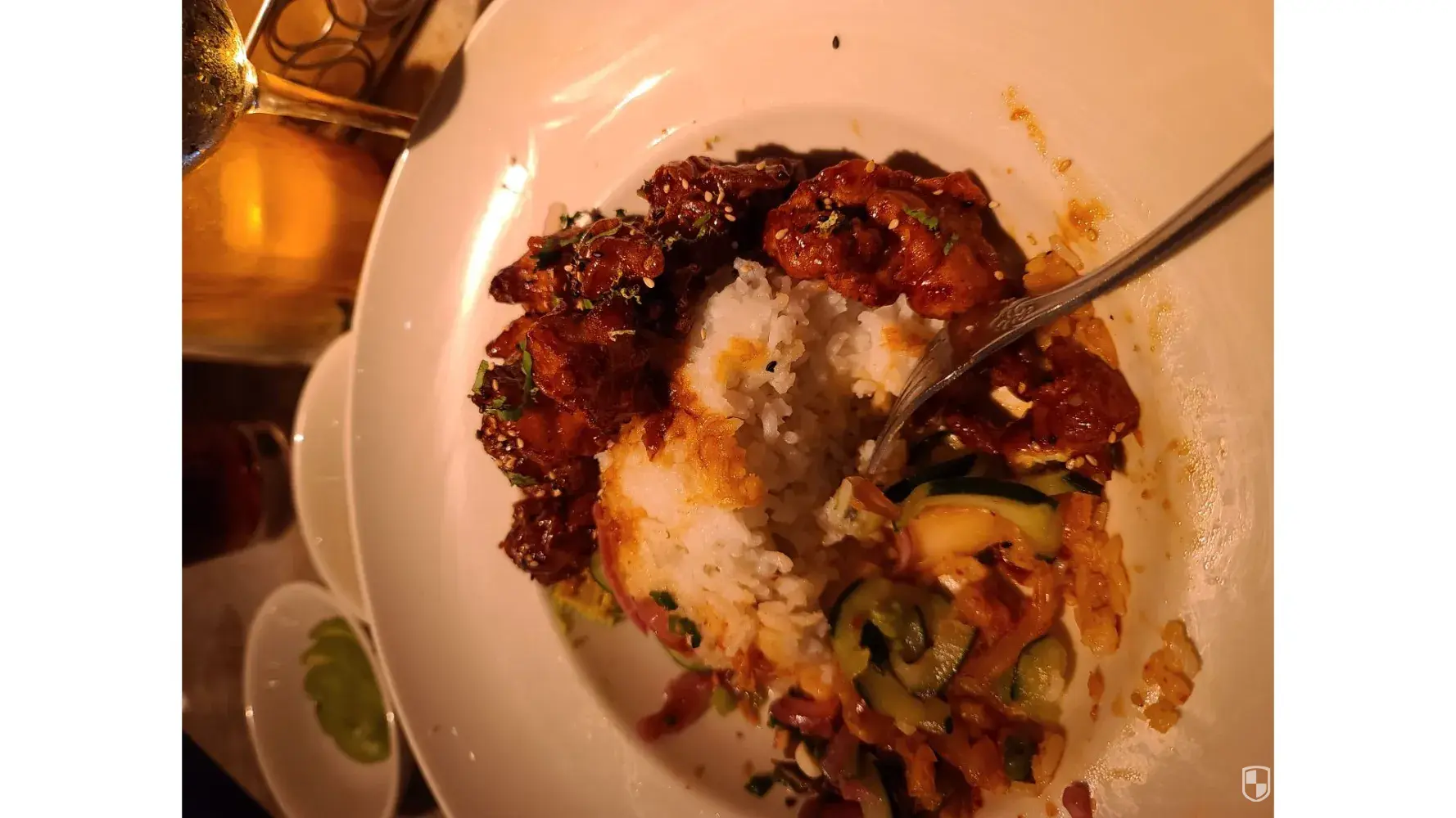 Our 29th wed anniversary. we received our order we had a very difficult time biting n chewing the chicken. Abundant amount of rice was so much. it was like the chicken was refried we notified our waiter n he said he would let the cook know. The cook nor the waiter did not come back to apologize or replaced our meals with fresh chicken. t advertise menu...