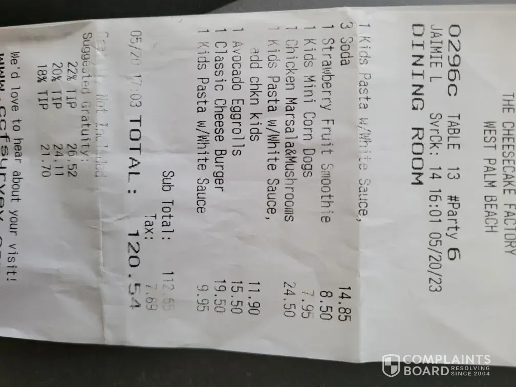 Terrible Experience at The Cheesecake Factory: Long Wait, No Food, and Outrageous Bill