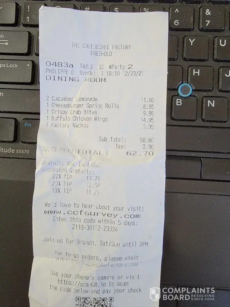 i took my wife to cheese cake factory located in freehold, NJ, on December 23rd. for the drinks we ordered lemonade, which tested really bad, i think was made with tab water which is not really great in NJ. then we orders appetizers. chicken wings was so bad, it was so dry, and tested like it was fried and thrown in the oil over and over. cheese burger rolls, was so greasy, and fatty. nachos was not even crispy, and had some of artificial, lumps of cheese on it. the crab cakes were ok.
