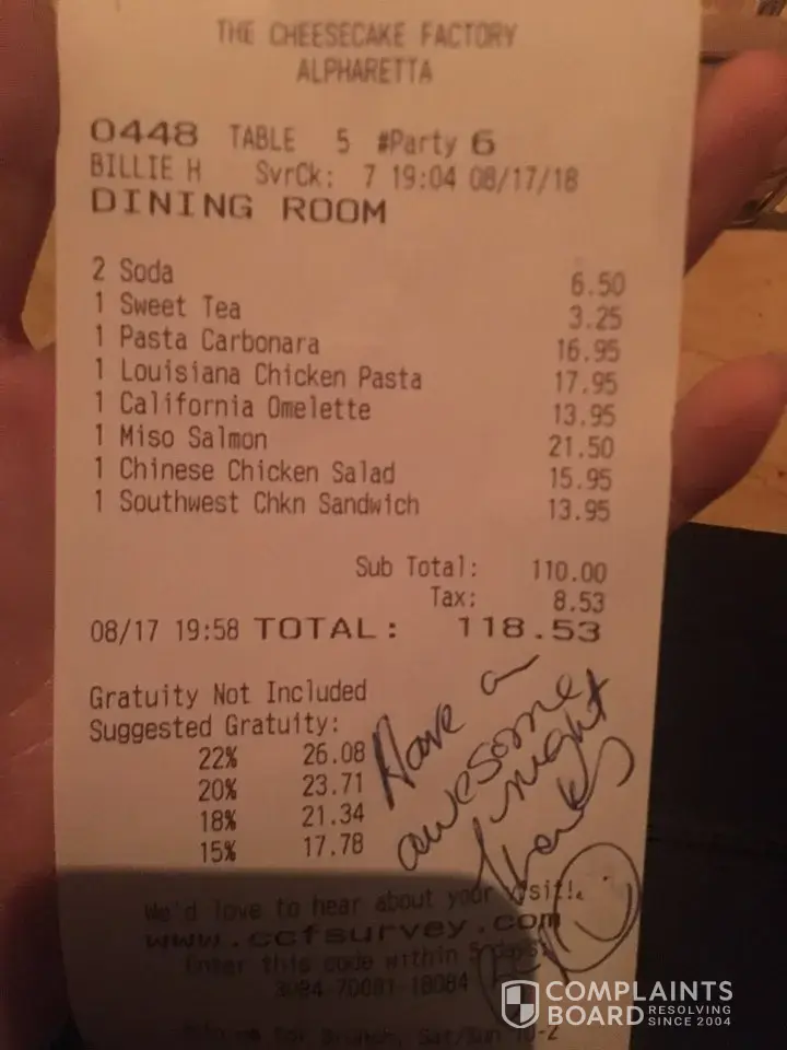 This could happen again. Is this the policy of the Cheesecake Factory? I'm planning on putting this on Facebook to let other people know how they may be treated if they don't leave a tip to a waiter. His conduct was unprofessional and scary. This is something that you really need to address. My plan is to go to Columbia to talk to the manager and to see if this man is still there.