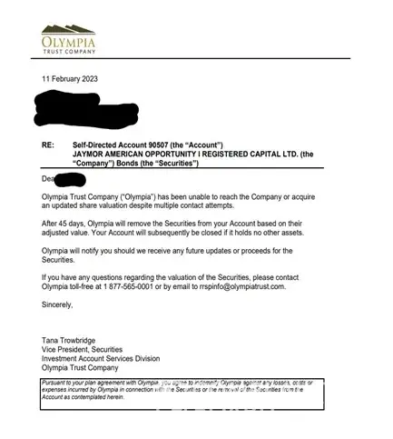 I invested $10000 in 2012. I wanted to transfer the money into RRSP in 2020. I was told the it will not mature until 2024 , however, now I received an email from Olympia trust that they no longer have jaymor and my investment is 0.