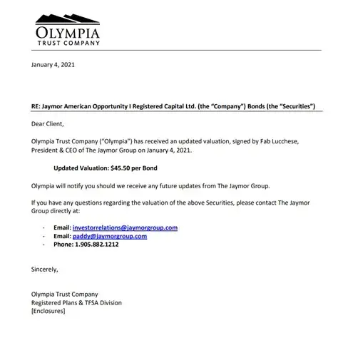 As with others on this string of complaints, I was notified that the valuation of these bonds was $45.50 on January 1, 2021 (in a letter written to Olympia Trust by the founder Fab Lucchese). On April 4, 2021 Olympia indicated that they couldn't confirm the value of these shares, and on July 4, 2021 they reduced the value to zero.