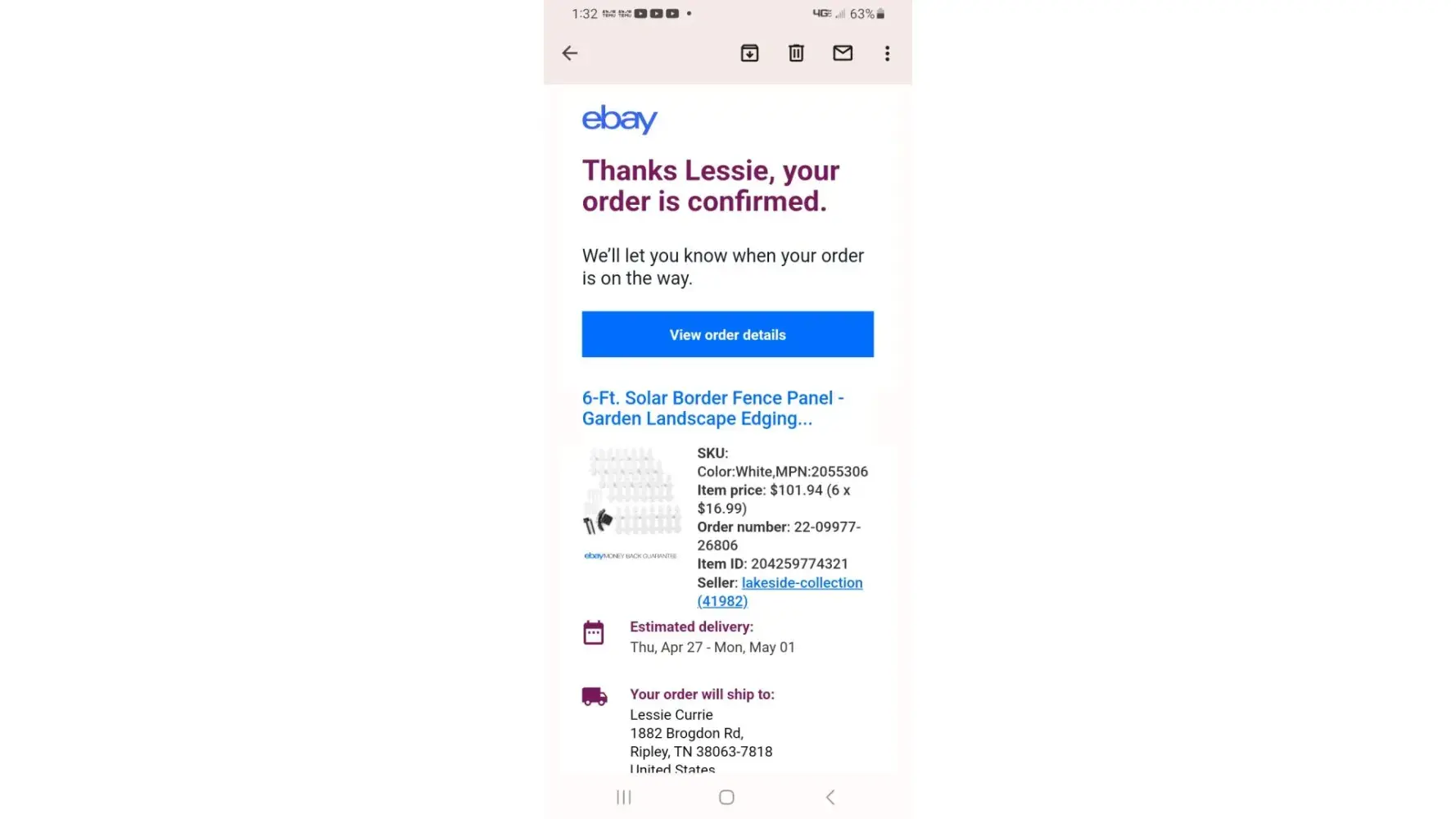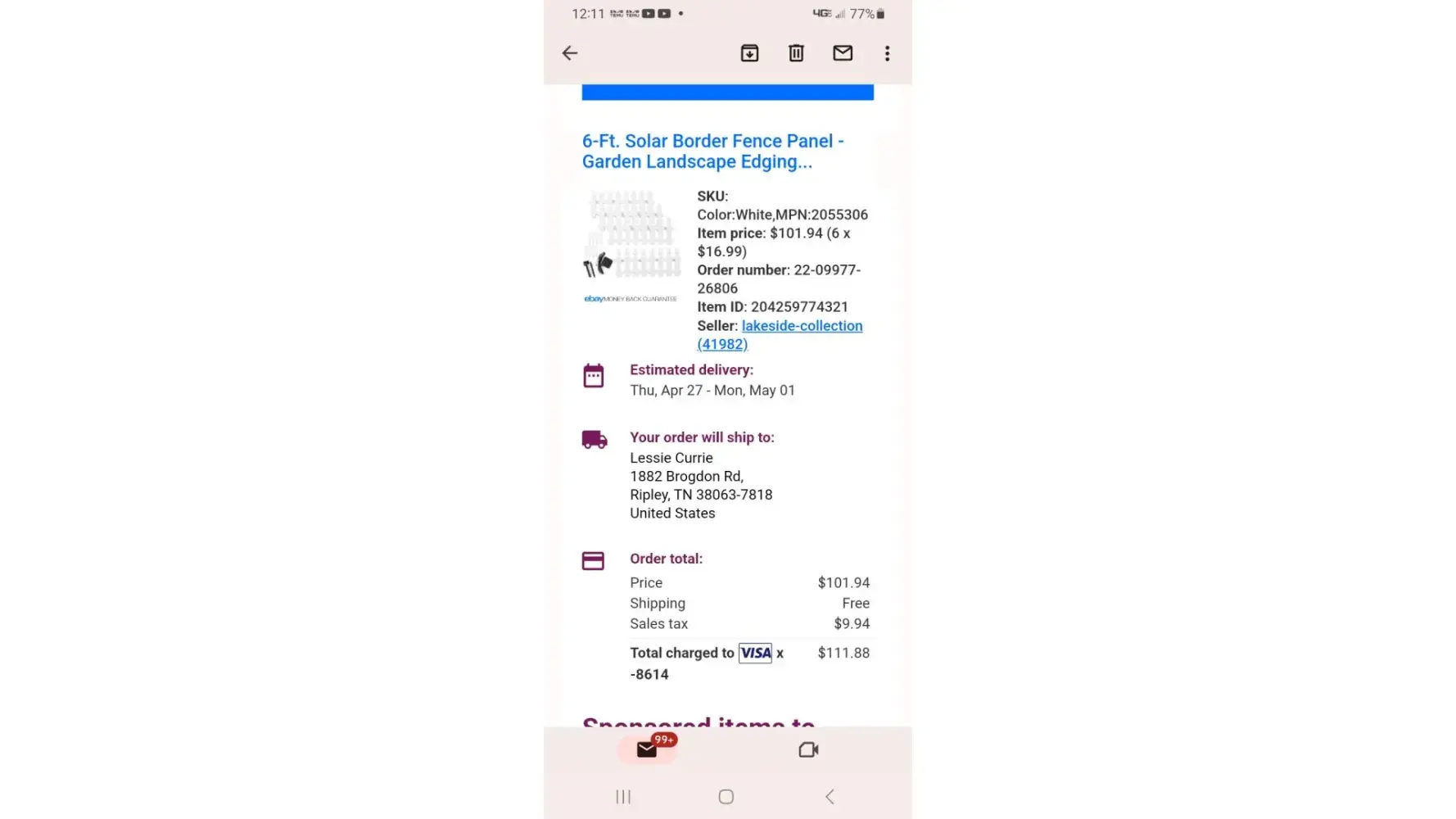 Item number [protected], 6ft solar border fence panel garden landscaping edging stake, order number [protected], ordered on April 24, was to receive by April 27- May 6