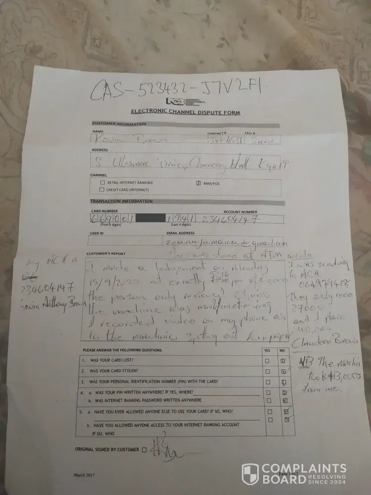 On wednesday september 16 my partner was making a deposit at the machine at knutsford new kingston. He added 23k and then the option that says add more he added 13k more. The machine only registered 27 when the 13k was added he the machine started to let out multiple receipts saying error but didn't give the money back and took while to release the card. He called the customer service rep but ofc nothing was really done other than her telling him to give it some time it will reflect it didn't.. I then advised him it's better to go in cause they can't be trusted when he went the rep just basically tell him the same thing anways I knew something was off so I called and spoke with a rep in friday I think and she said that nothing was submitted from the initial call however she submitted a case number for me cas523247g1lp2 my boyfriend got cas523432j7v2f1 because he had to go back the money didn't show up as the first girl told him. Anyways the girl I spoke to name was tashana. C spoke to her about 11 am she said the issue would be escalated nothing was escalated from I got an email stating that it's been worked on from last week I got no further follow up I instead called again and spoke with josh. B he said that it wasn't escalated so he will do it and I should get an update on a few which was the 23/9/2020 at about 6 nothing came to even say they received the update, spoke with jada. T on the 24th she said she is gonna send an email and call me back, she didnt at the time she said she would, called back again and got tamiera. E at about 10:43 asked for her supervisor she gave me shamir. L she said that she will call back in a few she was the only person seem like she was trained and tamiera still haven't gotten an update this transaction was to be sent to someone he collected the cash and was sent it to me so I can complete the transaction then bank doesn't care about that instead it's the run around I want my money the persons who manage their instagram page is so unprofessional reads message and doesn't respond either i'm sick of ncb that's the video showing the receipt coming out after the machine started to. Malfunction
