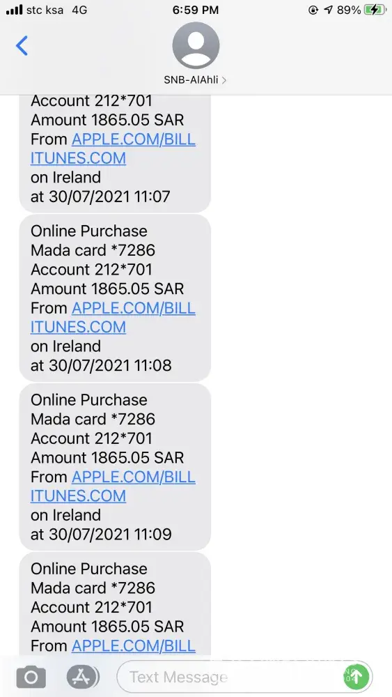 I woke up this morning with a message of: "Online Purchase Mada card *XXXX Account XXXX Amount 1865.05 SAR from APPLE.COM/BILL ITUNES.COM on Ireland at 30/07/2021 05:25". I have never purchased anything from apple, this sms received 5 times in my phone. And then when I checked my balance through NCB app, only did I found out that I was deducted of such amount 5 times costing me more than 9, 000 SR. I had already reported thru costumer service and received a message that they will come back to me after 2 months. This is very frustrating. I hope they will refund my money as I have bills to pay and family to feed.