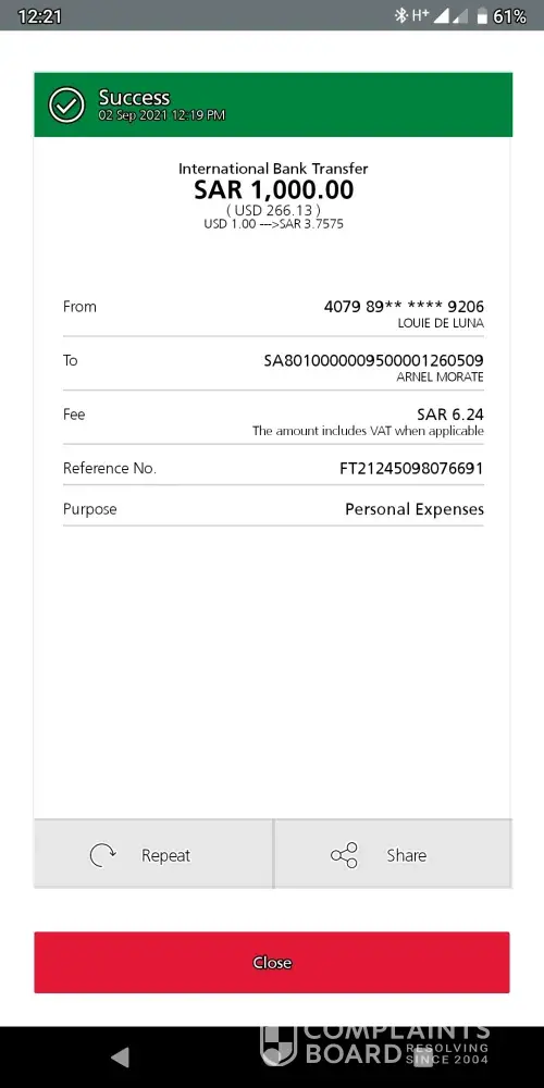 My brother in KSA had sent money to my account yesterday and I didn't receive that amount in my account in Pakistan. I will share the complete detail of my account and the text my forward to me.