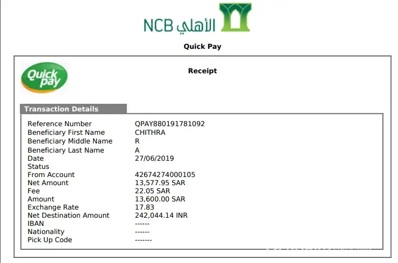 I transferred money to my Pakistan account using NCB mobile application. Below are the transfer details;
