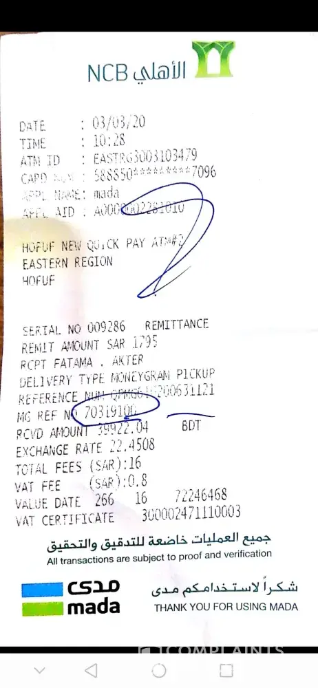With due respect, Last 6 days before I have transferred amount to MoneyGram in Bangladesh from NCB account regarding this Ref No. QPMG828200920839 but not yet received until now, kindly send me MG Ref. Number because when my family person go to moneyGram they demand 8digits reference code but I have this Ref No. QPMG828200920839 but moneyGram office is not paying, hereby is attached sending money picture on 1st april 2020, last month I have sent money through atm also thats picture is attached, in this picture 2 references numbers are mentioned but we can get money to using MG Ref. No; thats are 8digits, I don't have 8 digits number. kindly send me MG REF. 8 digits number for gettting money from MoneyGram or refund money.