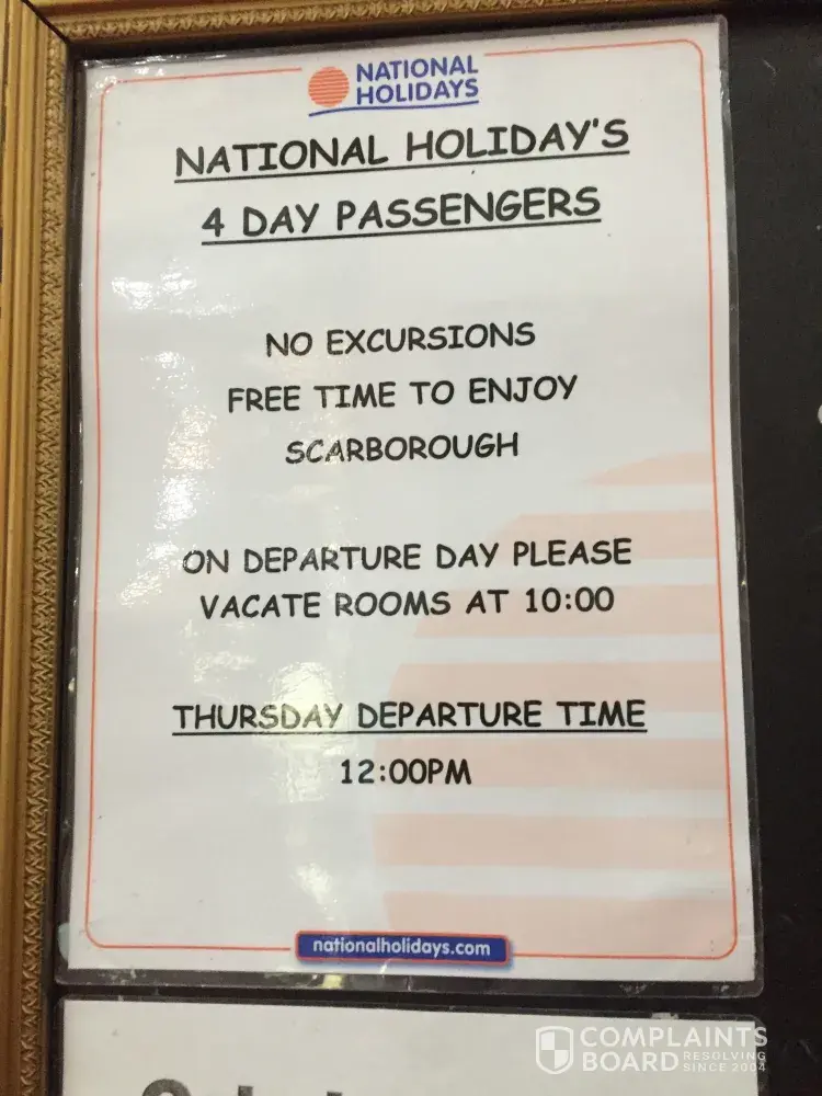Went to Scarborough 26th August 3 nights, when arriving at the hotel the driver informed us that Elaine would specify certain aspects of the trip one being the pick up time . She expressed 4 times that we must be ready in the foyer for 12 o clock and there was also a notice at reception desk all week furthermore pushing this point. The destination as in Scarborough is an amazing the place, the hotel the Grand needs a lot of work and I wouldn't stay there again. Come the day to travel home my mother who has joint problems and my child are all waiting with the rest of the people at 12 and the coach was a no show . After half an hour with my mum now in pain after being stood and my daughter cold we go back inside and others shortly follow, multiple people ring National Holidays getting varying information back, 1 the pick up time was always 13.30 and they have no idea we're we got that information from, 2 there has been a mix up with the driver and will be there for 14.00, 3 there had been a crash on the motorway and they will be at least 50 minutes . This really spoilt our trip we could of made the most of our last day and gone and done something if we were aware it was going to be such a late pick up as the drive arrived 14.15 so we sat around for 2 hours 15 it was a very long frustrating day. When the driver arrived he was very arrogant no apology and said he had no idea where we given that information and didn't diffuse the situation at all. The information was from staff working for national holidays and we have the poster which was up saying 12 pickup all week. Very dissatisfied with miss information and customer care.