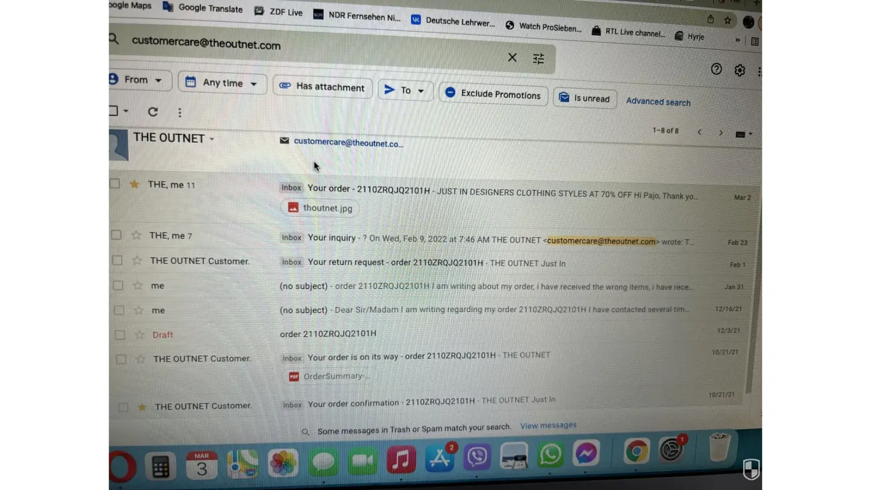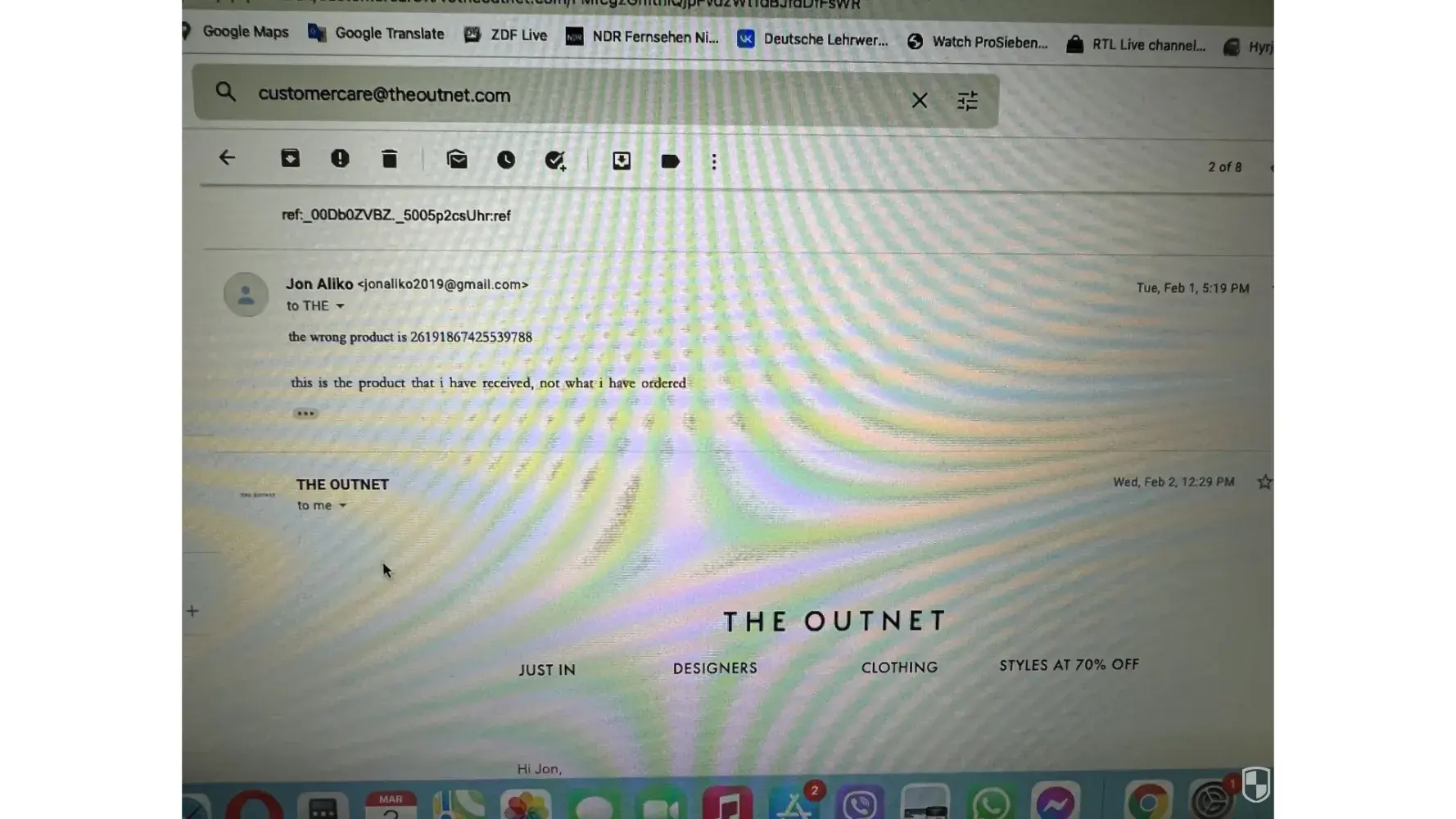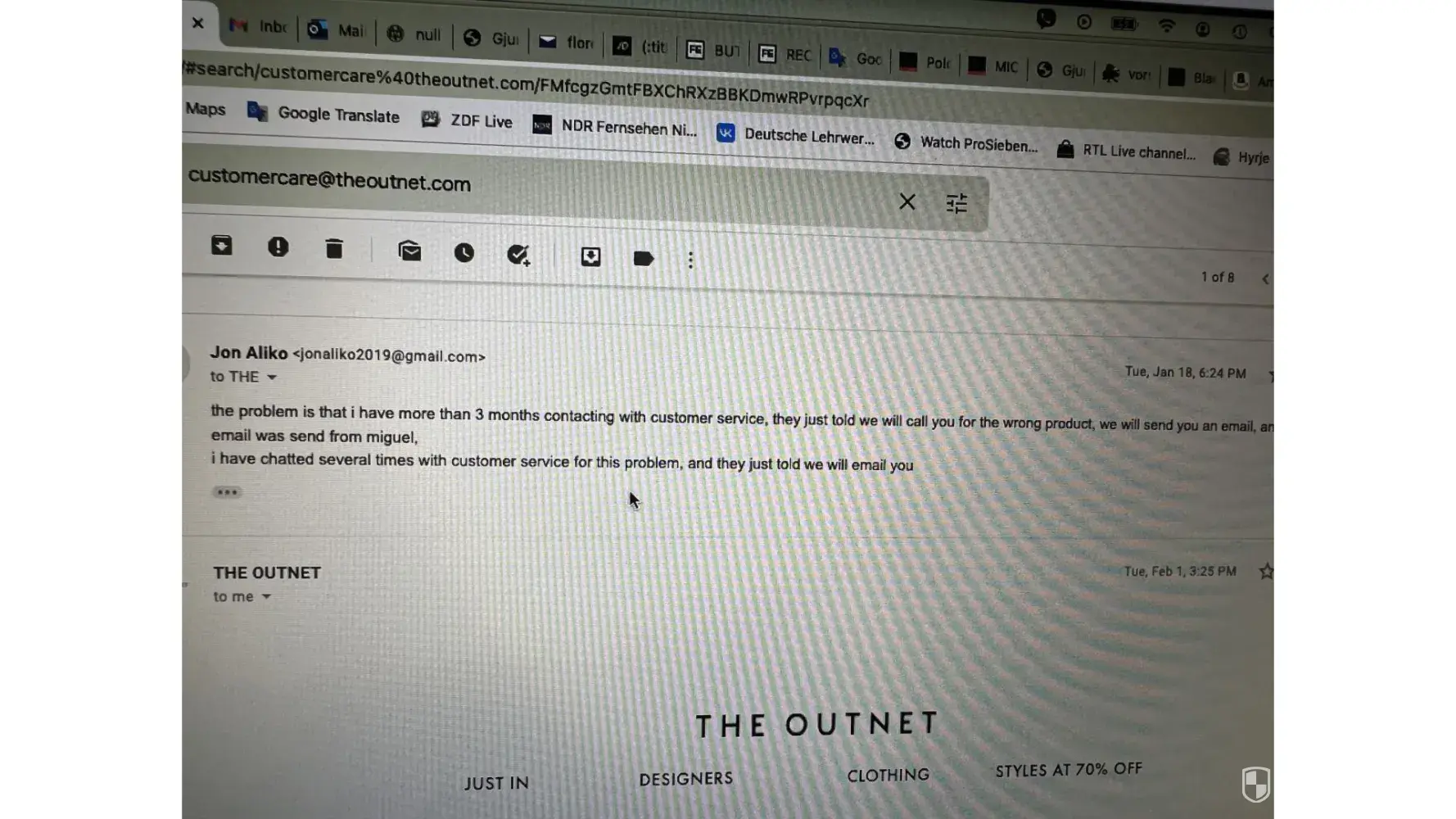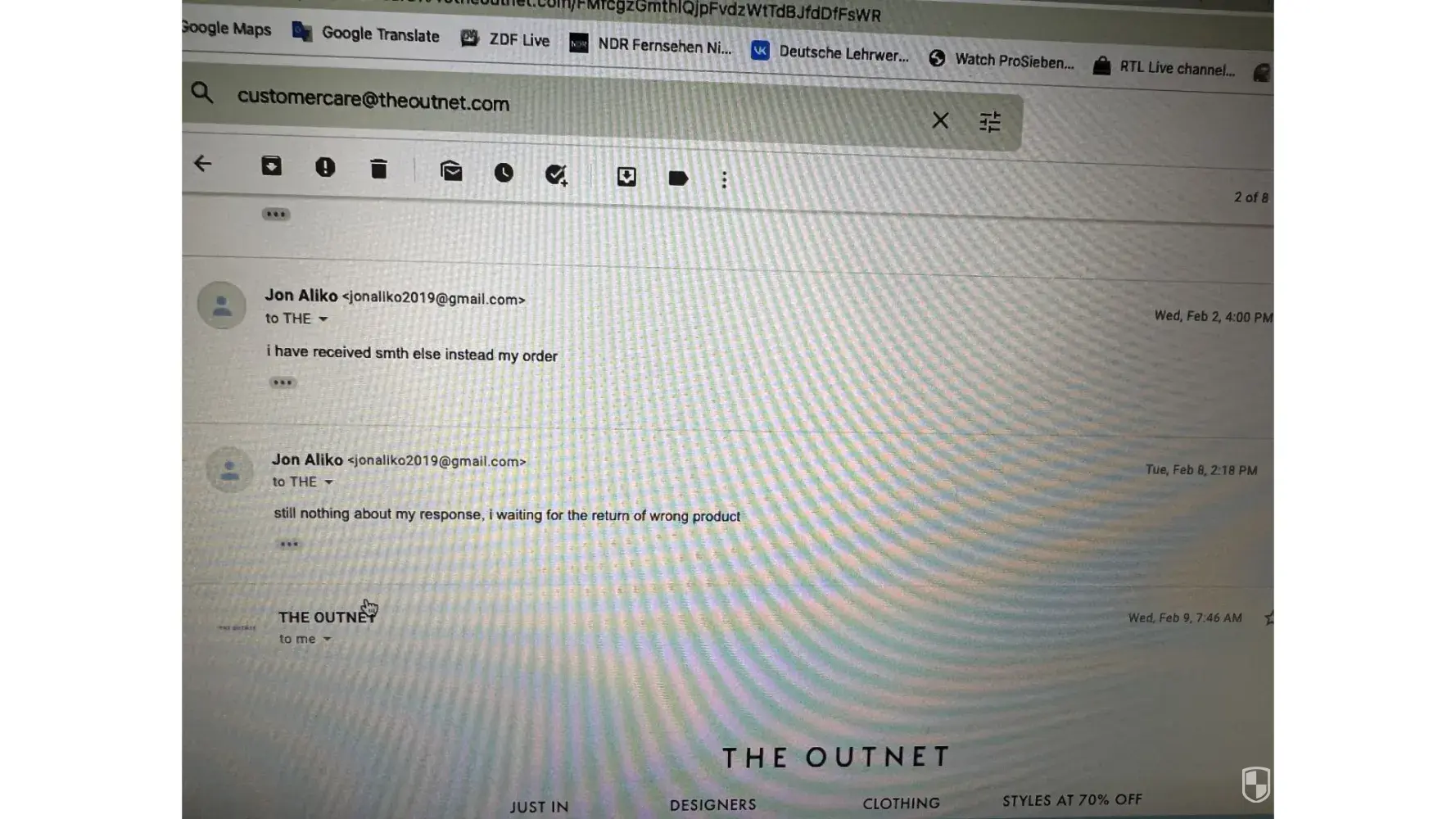 Below i have attached emails with theoutnet, but the chats and the phone call i have no photos.