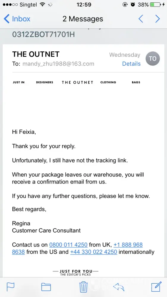 I bought a bag from theoutnet only to have them call me and tell me that, too bad for me, they didn't have the bag. They offered no compensation or apology for their mistake. I shop a lot online and it is rare to encounter customer service that is so difficult. I will not be shopping there in the future. One of the most disturbing things about shopping online is the idea that you don't know if you will get the item.