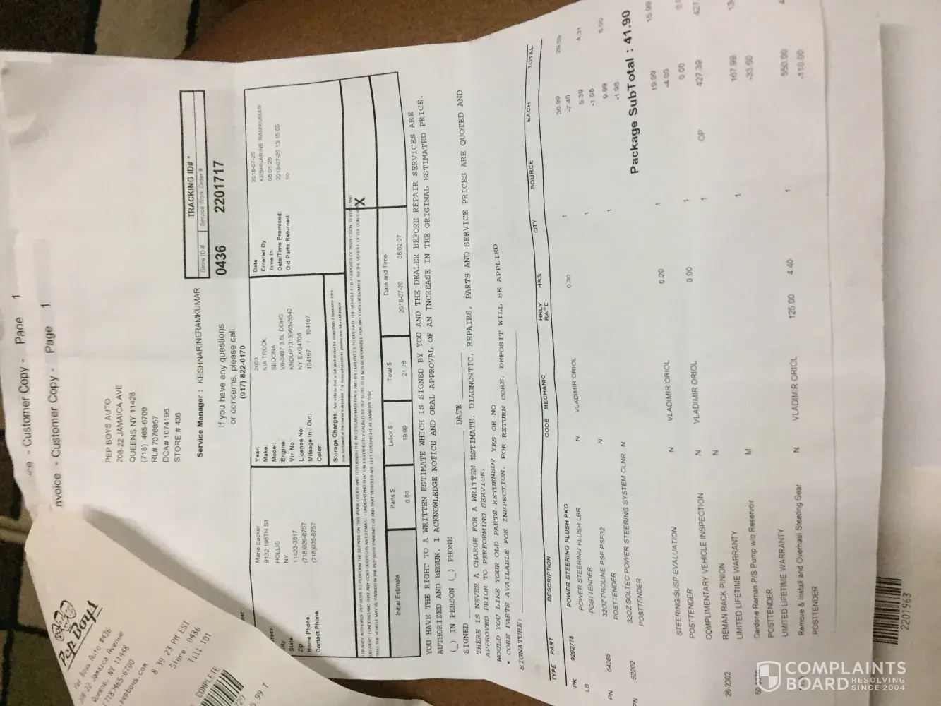I went to pep boys so they can fix the stering well of my Kia Sedona they charge me 1766, 75 and the car break down on the stree the day after .i went back to the store get the car for repair they find the belt came off the told me everything it's ok, went back home the day after the light is on now I have honk problem . I went back again they told me it's electric problem they can fixe it .