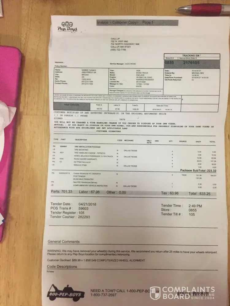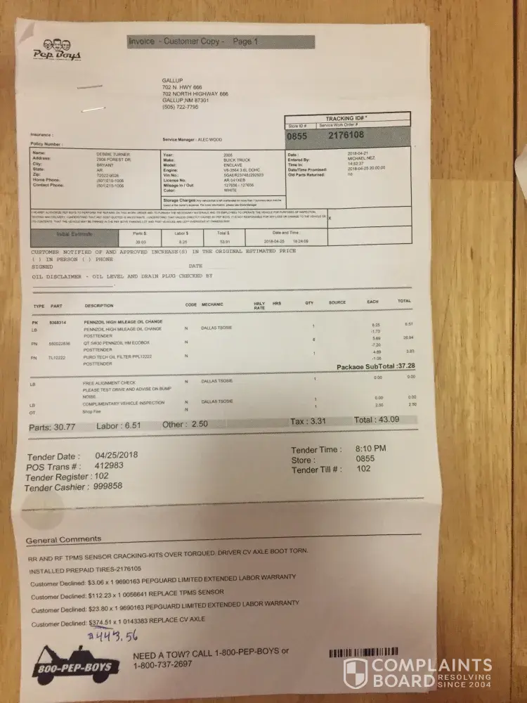 Approximately a month later, things got worse, I returned the vehicle to the same pepboys (chino, ca) where Don, the manager was very contrary and disobliging; explaining that my dates of repair were wrong and that regardless of what the estimate done on April 21, 2018, it did not matter and it was not pepboys problem.