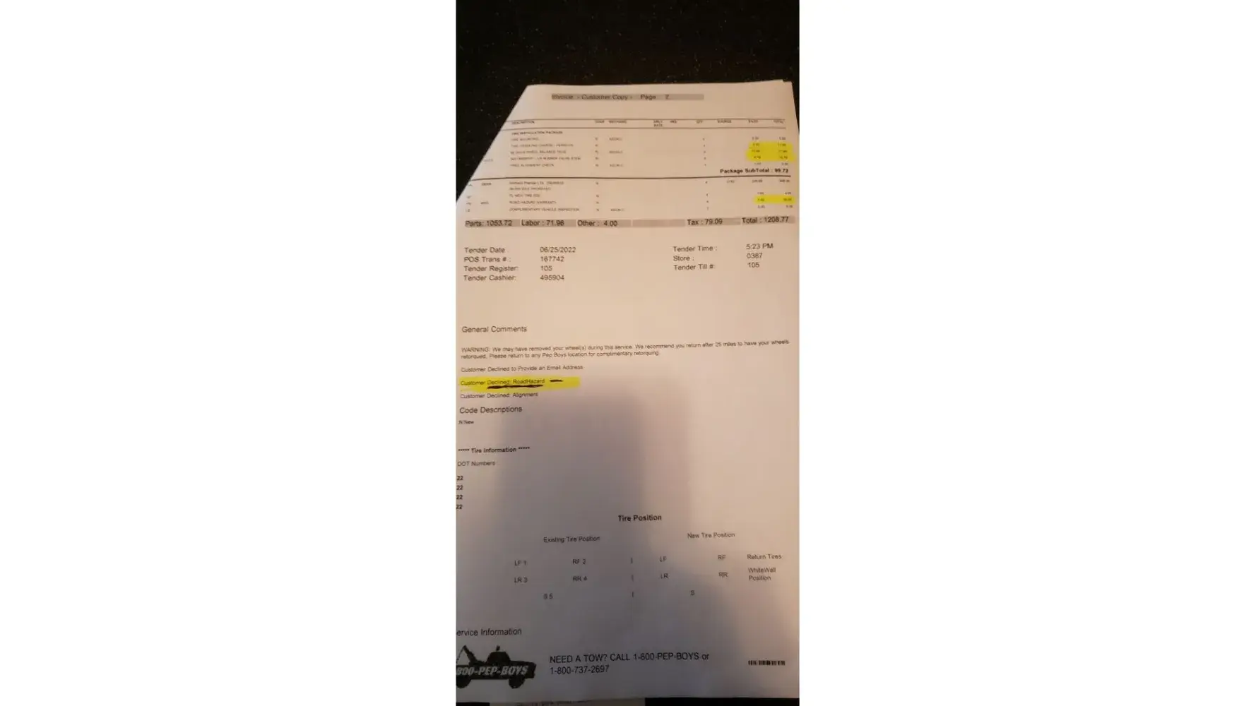Desired outcome: I want money back for difference in phone quote and bill that was just padded up. Call other 954 numbers and you will get other prices that I could have had tires done for. Bill shows declines and all add on parts I never asked for.