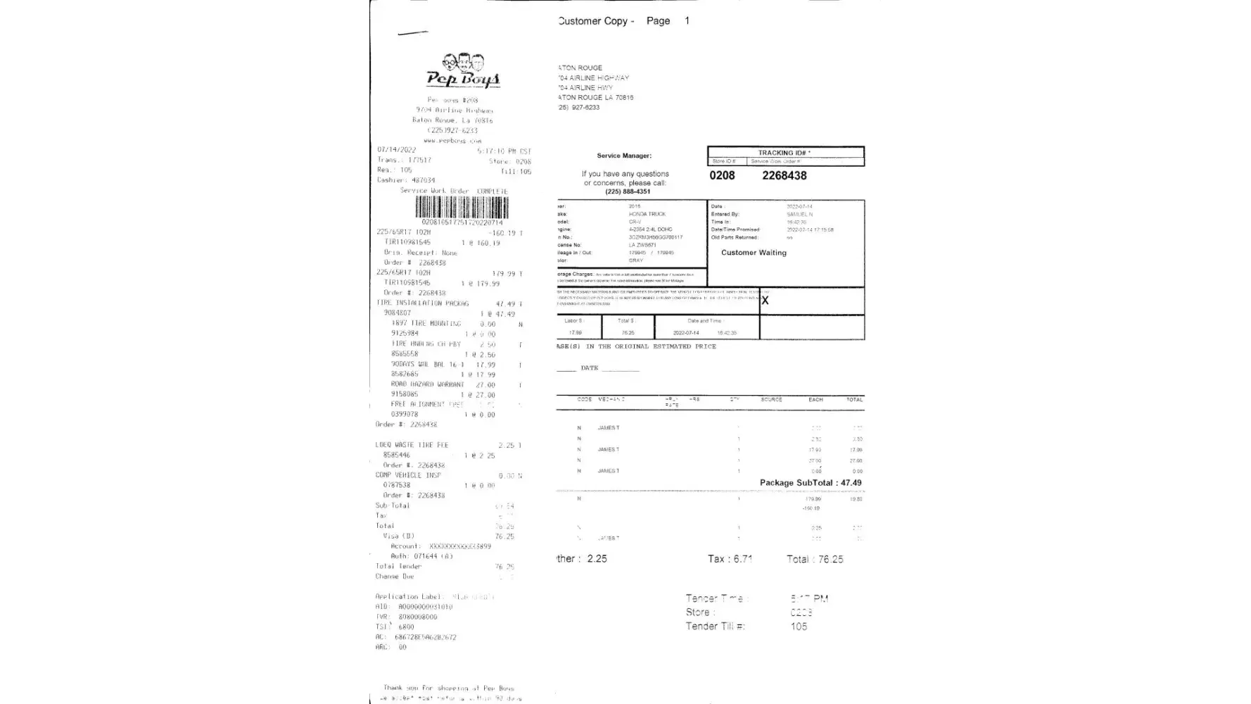 I have spent a total of $6,086.73 getting my suspension repaired at your 345 4th Ave, Brooklyn facility. On 12/8/21, I brought my 2014 Cadillac to your 4th Avenue, Brooklyn facility indicating a sound emanating when I brake or depress the accelerator. After a $3,064.55 repair bill the issue was not resolved. Recently my ABS and traction Control lights highlighted on the dash. I took the car to Cadillac and during examination, he discovered that PEP Boys, according to the Cadillac Technician, in writing states PEP Boys “left front wheel speed harness and convector damage. Right front suspension harness from strut damage due to suspension repair at PEP Boysâ€.