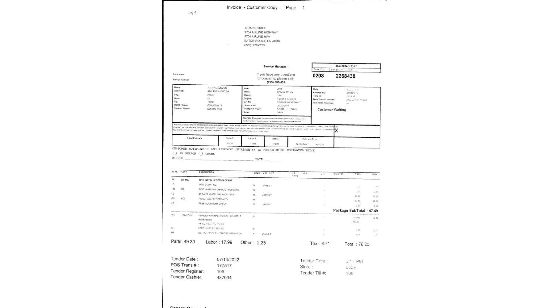 On 6/24/22 I came in for an oil change and tire rotation to SM location as always only this time my car was there for 3 hours When usually all listed below is done within 2 hours tops! I am not sure if the oil was even changed even though I was charged for a synthetic oil change and service. Cant tell if my tires were even rotated as they are under inflated and not filled to specifications as they would be after a service. Untouched! My washer fluid is empty as well and there is no sticker showing next oil change date and milage that is usually put on the windshield. I am very concerned and upset that the basics were not done and left me wondering if anything was done at all?!?. Location #1672 order#2129594