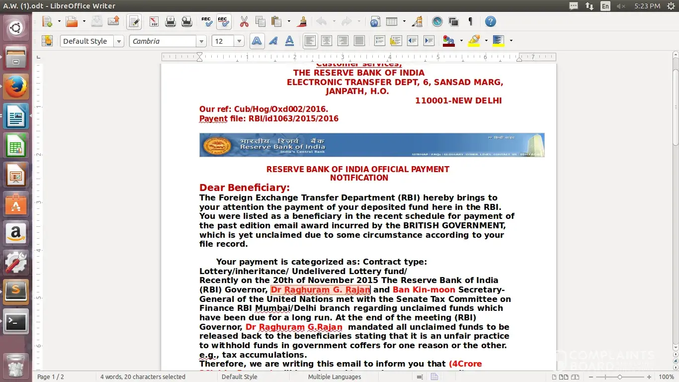 Recently on the 20th of february 2012. the reserve bank of india (rbi) governor, dr d. subbarao and ban kin - moon secretary - general of the united nations met with the senate tax committee on finance rbi mumbai / delhi branch. regarding unclaimed funds which have been due for a long run, at end of the meeting (rbi) governor, dr d. subbarao mandate all unclaimed funds to be released back to the beneficiary stating that it is an unfair practice to withhold funds for government basket for one reason or the other for tax accumulations. therefore, we are writing this email to inform you that (£500, 000. 00 gbp) will be release to you in your name, as it was committed for (rbi) governor that beneficiary will have to pay crediting fees only. so you are therefore required to pay (18, 500 inr) only in cash deposit. to credit your account immediately making a decline for 2 working days after date of receiving this mail.