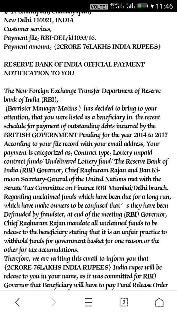 The Reserve Bank of India (RBI) Governor, Dr Raghuram Rajan and Ban Kin-moon Secretary-General of the United Nations met with the Tax Committee on Finance RBI Mumbai/Delhi branch. Regarding unclaimed funds which have been due for a long run, At the end of the meeting (RBI) Governor Dr Raghuram Rajan mandate all unclaimed funds to be released back to the beneficiary stating that it is an unfair practice to withhold funds for government basket for one reason or the other for tax accumulations. Therefore, we are writing this email to inform you that (3CROER 6LAKHS INDIA RUPEES) will be release to you in your name, as it was committed by (RBI) Governor.