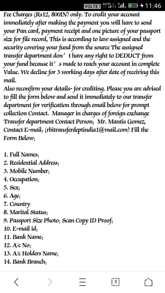 To credit your account immediately you will have to send copy of your pan/voter card, and one picture of your passport size for file record, this is according to law assigned and the security covering your fund from the source the assigned transfer department don’t have any right to deduct from your fund because it’s made to reach your account in complete value. we decline for 5 working days after date of receiving this mail.
