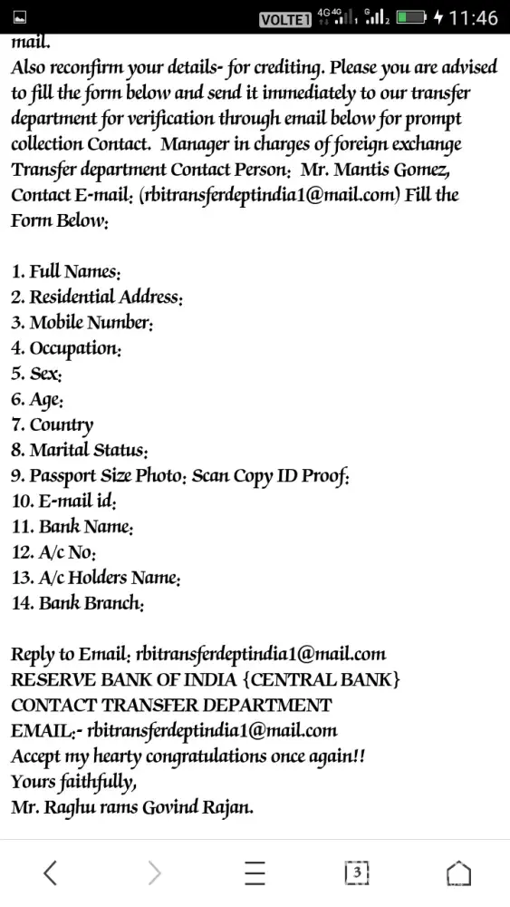 The Foreign Exchange Transfer Department (RBI) hereby bring to your attention of the payment of your deposited fund here in the RBI, you were listed as a beneficiary in the recent schedule for payment of the past edition email/sms award incurred by the BRITISH GOVERNMENT, which is yet unclaimed up-till date due to some circumstance.