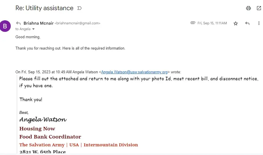 I reached out to salivation Army at [protected] servicing zip code 80241 for utility assistance. I did the complete intake process, I was told by customer service that someone would reach out to me in two weeks. This was around August 1st 2023. I did not hear back from anyone so I called customer service back. They said they didn't have my info and I needed to re-do the intake process. This time they gave me the name of Angela Watson and the number to reach her. I called and left her a message and gave her all of my contact info. After another two weeks on 9/15/2023 she sent me an email requesting that I send her the Application, bill and ID to her. I sent all required documents back to her. Now its Oct 16 2023 and I still haven't heard anything from anyone. There is no one other than Angela to contact at this location.
