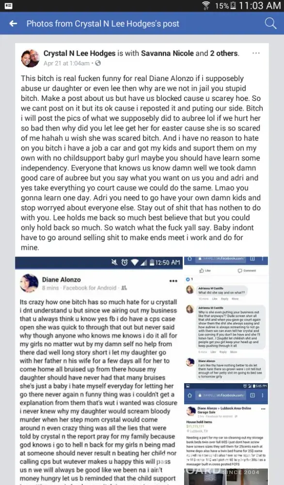 I would like to just announce for anyone around this particular facility that if there is an employee working around achild or children and vulnerable people who relies on the help of those from your organization, I do not think someone who finds joy in fighting on the streets is the right person to be in a working living environment with so much hostile for those in need.. Especially someone who is suppose to represent your organization. I would be absolutely embarrassed if this was one of my employees... What usually happens outside of work should not matter if your a waitress of some sort with no life, but this young lady Crystal Garcia out of your lubbock tx location is an absolute embarrassment for a non profit organization like salvation army.. just take your time in reading her outbursts... I wouldn't be surprised if she is hostile with the children and parents... I would advice you to find a replacement someone already safe to be around.. I would not take or recommend your facility as long as she is employed.. I would hate for this to go public.. The act of a salvation army employee.. to be ranting on fb about going to someones house to fight them and quote "I like when they fight back its called a challeng" what grown mother and employee of a wonderful organization like salvationarmy acts like that.. I'm sorry if she is left in that facility around children when she can not even control herself that is a high risk of endangering a child and people in general... Please look into to this and make sure someone with no shame and who is proud to act like an animal should be apart of your organization in great things.. I haven photos to show the extent of anger... I have message the fb of salvation army have yet to recieve a response and the director Erica Hitt also no response.. thanks in advance
