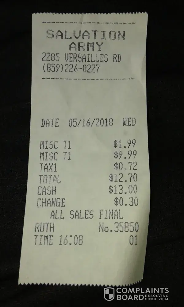 The Salvation Army store located at 2285 Versailles Road Lexington Kentucky phone number [protected]. Date May 16th 2018 at 4:08 p.m. I purchased two pictures for a total of $12.70 at the store call my mother after leaving the store and was informed that she did not have room for these two pictures so I drove back to the store about 15 minutes later and ask to speak with the manager on duty she informed me that all cells were final and wouldn't even listen to the reason I was bringing the merchandise back she was very very disrespectful so much so but it seem to offend the other customers around me I'm a veteran serve for 24 years in the United States Army and I understand the policy this retail store has I know that their business is to help people who are homeless and two otherwise help the community I don't mind not being able to return the merchandise but I feel as a veteran that at least some level of respect should be shown to a customer I will never shop at this store again and I hope the manager gets fired for being appear undeniable ginormous b**** thank you very much for your time and if you're in Lexington Kentucky make sure to tell the Salvation Army on Versailles Road to suck it