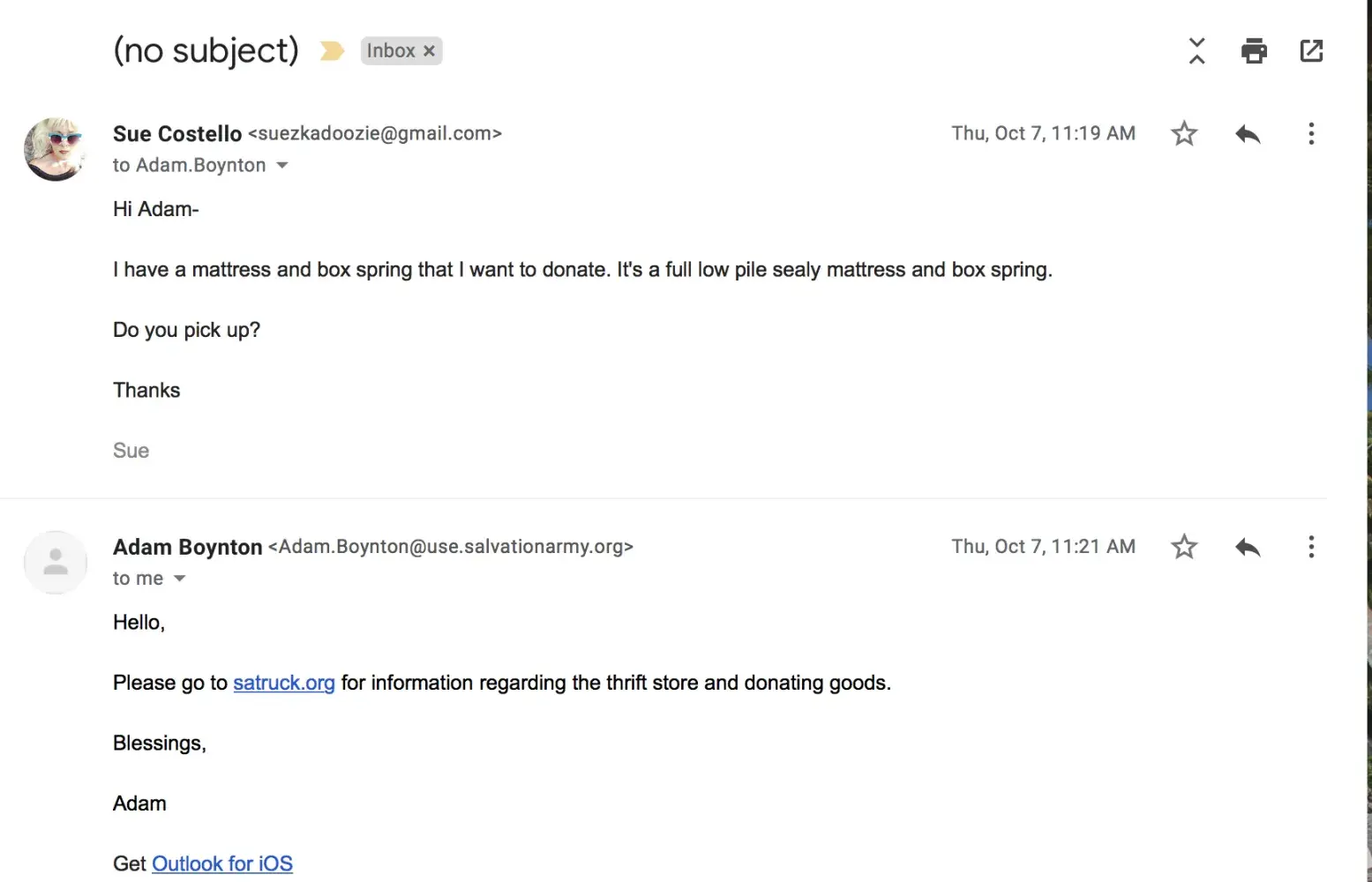 I had a scheduled pick up for a bed today. I have it in writing and two confirmed voice mails and this Morning a Michael called and told me after leaving a message that the men would be here today between 9 and 11am that they were not coming.
