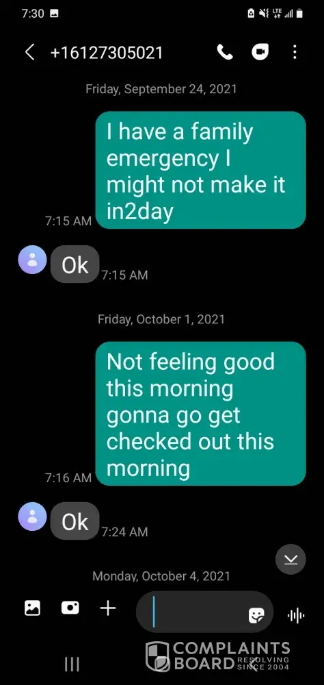 I was told I missed 4 days and was late 4 days every day I was late and didn't come into work I text PATRICK and he said okay