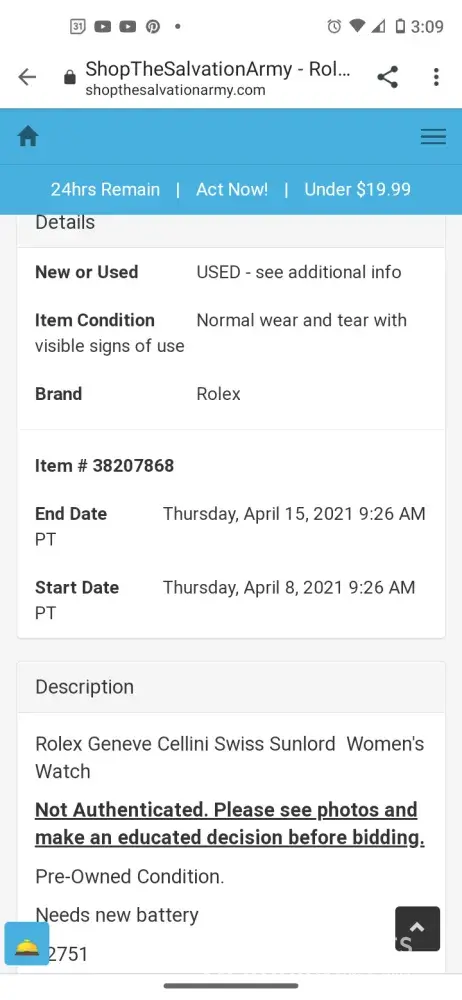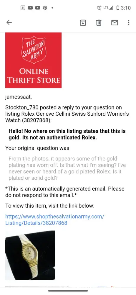 During a recent online auction, there was a Rolex listed. Oftentimes, the person who physically sees it can see things that you cannot. After viewing the photos, I posted a question asking if what I was seeing was gold plating worn off. The response I received was very rude from a Salvation Army employee who just got over $300 for a $20 watch (see attached photos). I have purchased several items from the Salvation Army (in store and online), but this definitely makes me think twice about making another purchase from the online auction. You kind of rely on the employees posting to represent the product to the best of their knowledge.