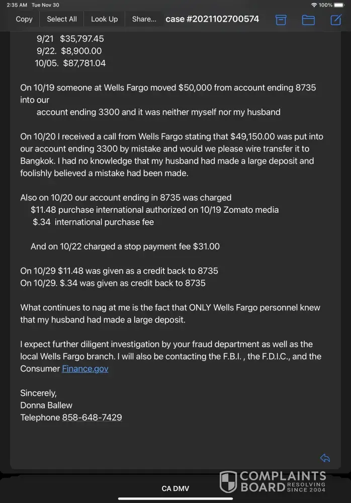 I expect further diligent investigation by your fraud department as well as the local Wells Fargo branch. I will also be contacting the F.B. I., the F.D. I.C., and the Consumer Finance.gov