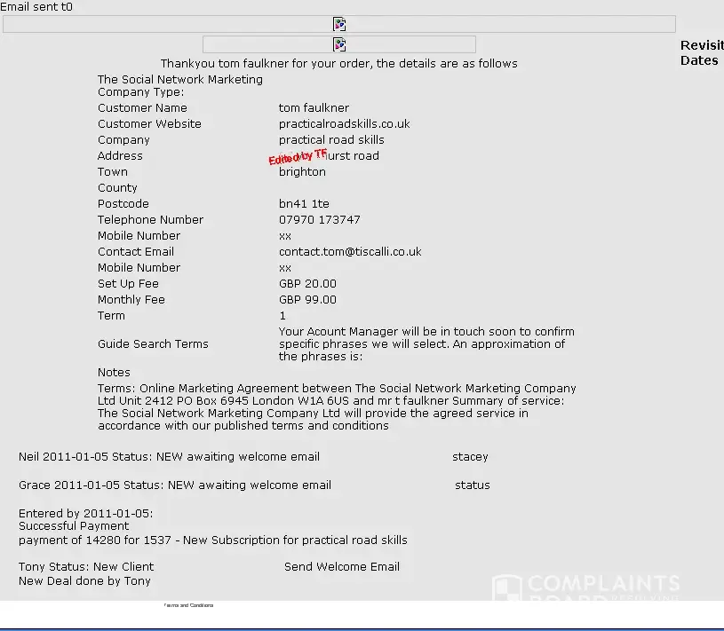Facts on 'YouTube' included telephone messages left for customers left in 2 different names, but made by the same person, and confirming the phone call from a 'fake' solicitor; which is an illegal act. The Social Media People has never refuted nor explained ANY of these calls and messages. (I'll gladly send you a copy by email if you wish.)