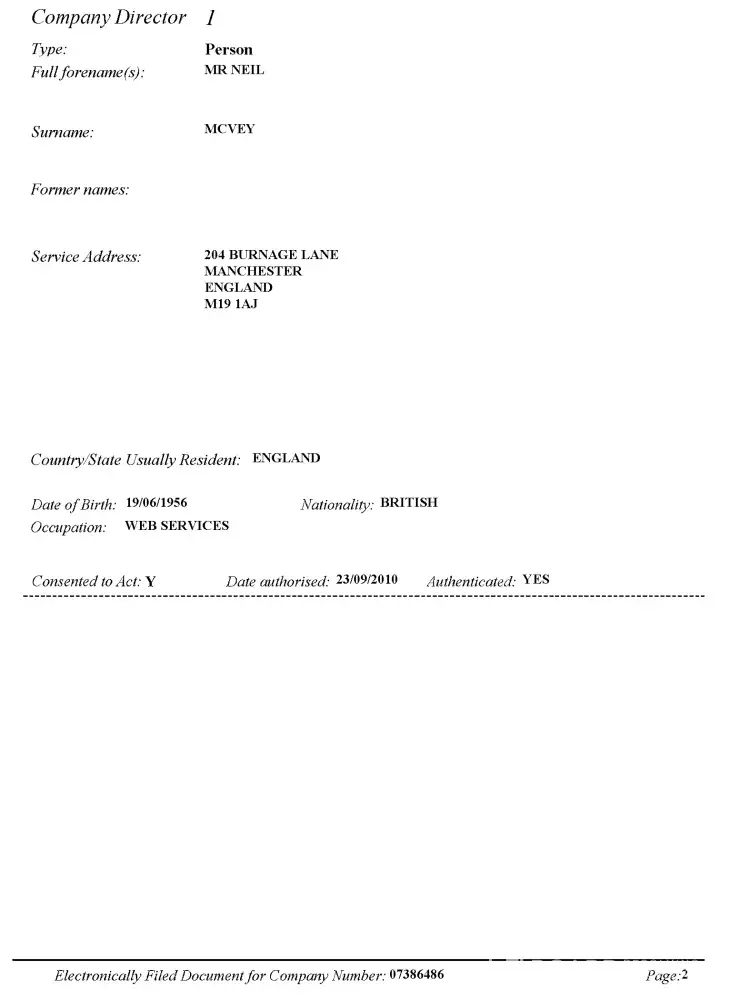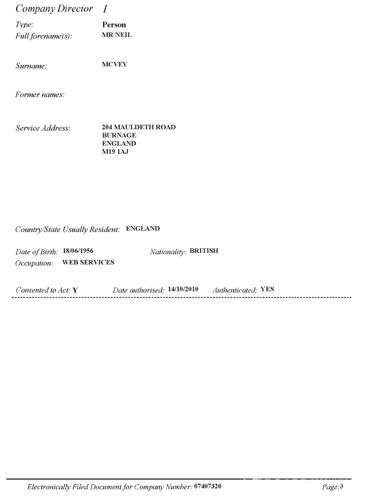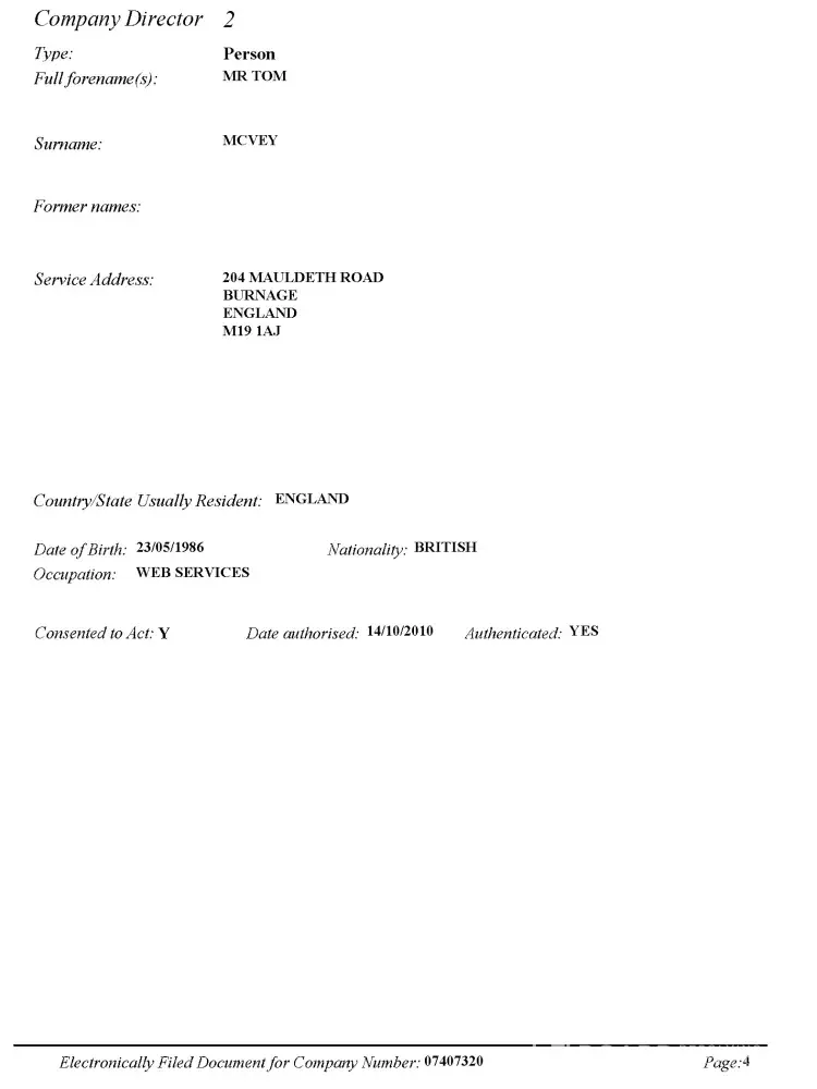 Referring to the attached, un-edited pages, from documents of Incorporation and Changes of Director Details, we can see that even on official documents, submitted to a government department, and on which the very existence of the Ltd. companies rests, Tom McVey lies. He records two different Dates of Birth.