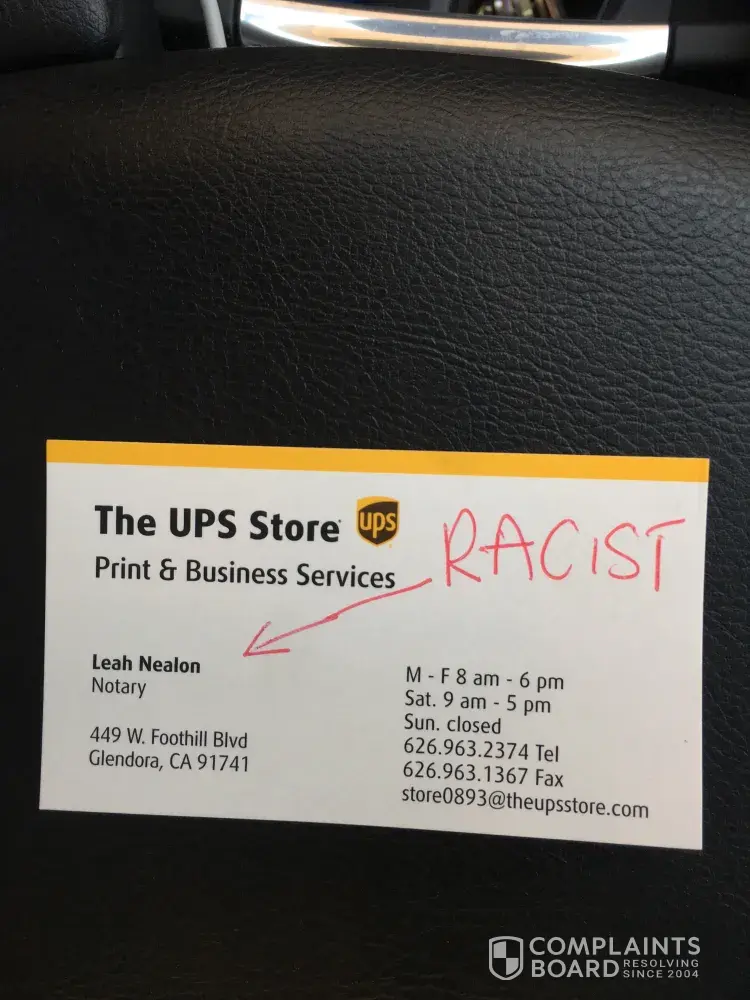 This racist Leah Nealon (UPS staff) looked at me and said my documents were forgeries. My God, because I am black. Prior to her attending to me, I saw her chatting and attending to other white customer and barely asking them any question before notarizing their documents. This is absurd and I will make sure I inform everyone through social media of my experience at this UPS store. This employee deserves to be sacked. UPS, Racism isn't accepted in America. You should be ashamed of this. I went to another notory office a few minutes later and got my documents notorized.