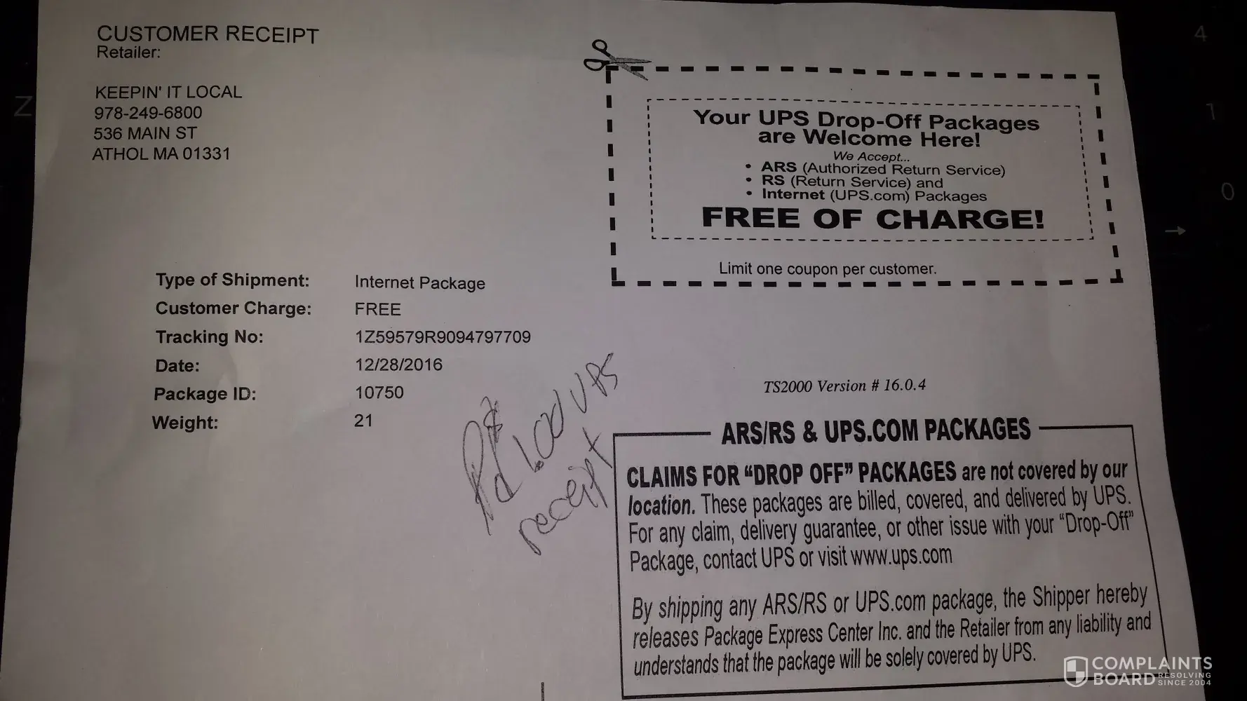 I brought a return ups package on 12/28/2016 at a ups drop off location: keepin' it local [protected], 536 main st, athol, ma 01331. I paid 1.00 for a receipt. Not sure why they charge all customers a $1.00 receipt fee. I didnt feel comfortable just dropping it off and not getting one so I paid the $1.00 for it. I have never had to pay for a ups drop off receipt before. Is that new do you know? He has a handmade sign at the desk displaying that if you want a ups receipt there is a $1.00 charge to get one. I also let the shipper know what happened since it was their return label and I should have not had any charges to pay out of pocket to return. The guy in the store didnt care at all. He said you either pay the 1.00 for the receipt or dont get one. So I paid but not happy about it.