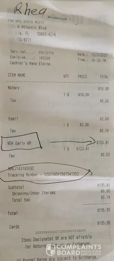 Approached UPS Store on 02 Dec, and spoke to Elaine. She treated the matter very lightly stating atleast the item was delivered next day, ignoring the fact that huge amount was paid for EARLY AM delivery. However, Elaine agreed to file a complaint and provide me confirmation number. But no action was taken, as assured