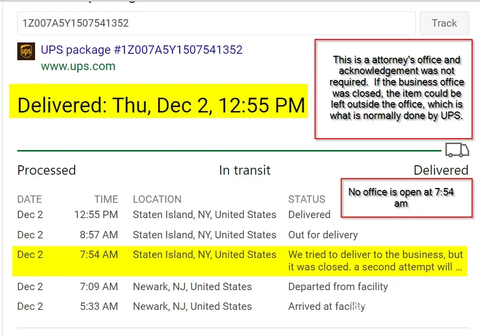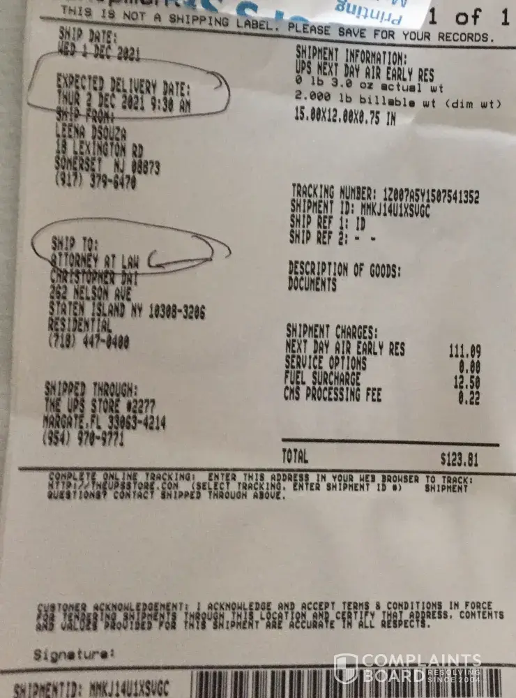 Objective of shipping out NEXT DAY AIR Early AM was for a specific legal purpose where document was required for a court submission