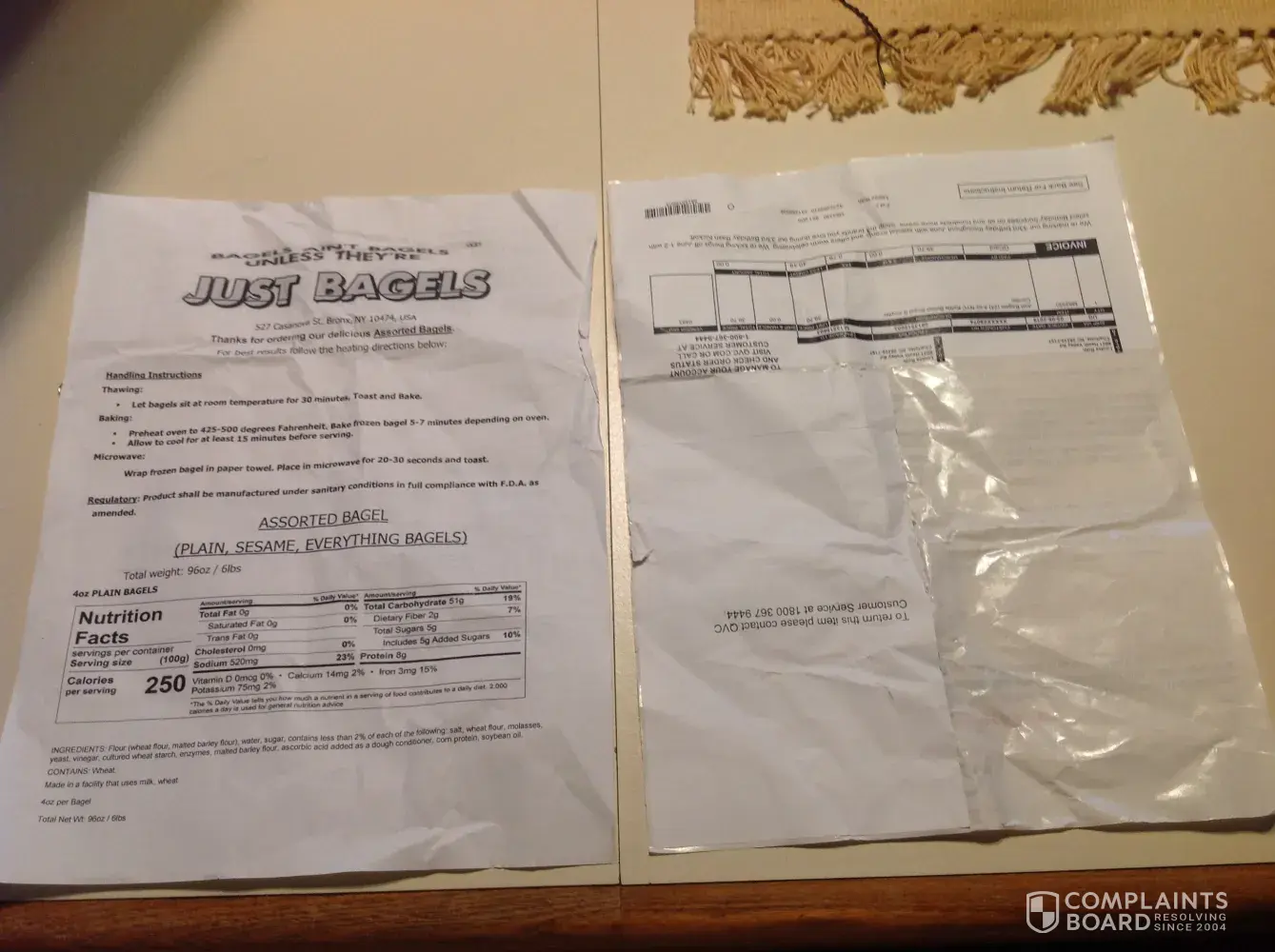 I ordered NYC Bagels from QVC and when it was shipped apparently the original box was completely destroyed and the bagels inside were smashed then someone repackaged my bagels into another bigger box and just ripped the shipping label off the original box and taped it to the new box. These were fresh bagels in plastic bags and one of the plastic bags was shredded on the bottom and the clip at the top was undone. Now, my question to you guys is seriously you would expect me to eat these bagels once it's been rolling around who knows where and damaged to boot. I was so disappointed when I received my package I've never had a package look like this from UPS. Don't get me wrong I love UPS but this is the second disappointment the first one I let it slide but this one I could not and I needed to let you know.