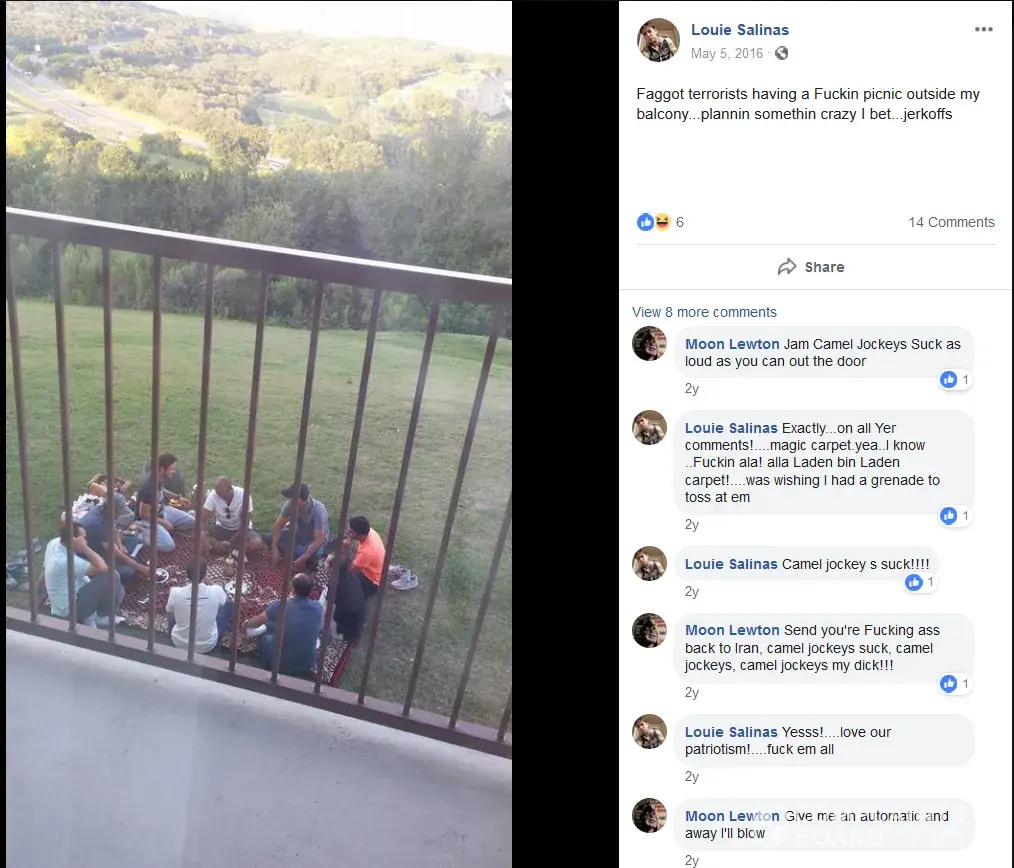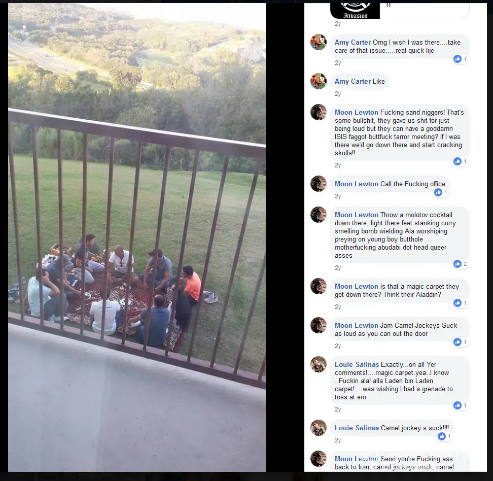 Here he is spewing hate on some people who are just having a small innocent picnic gathering outside. He calls them racial names and then one of his friends actually threatens the lives of the people saying "Give me an automatic and away I'll blow". His other cohorts join in with racial slurs as well. Completely unacceptable.