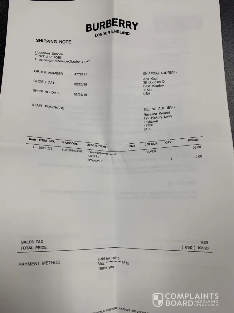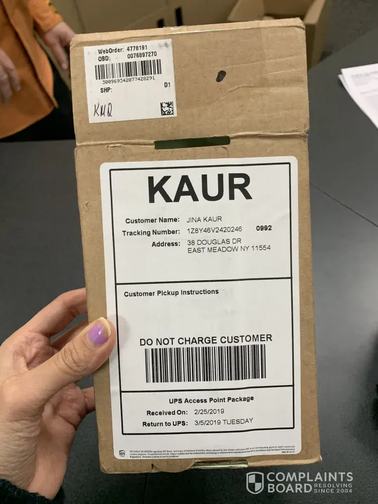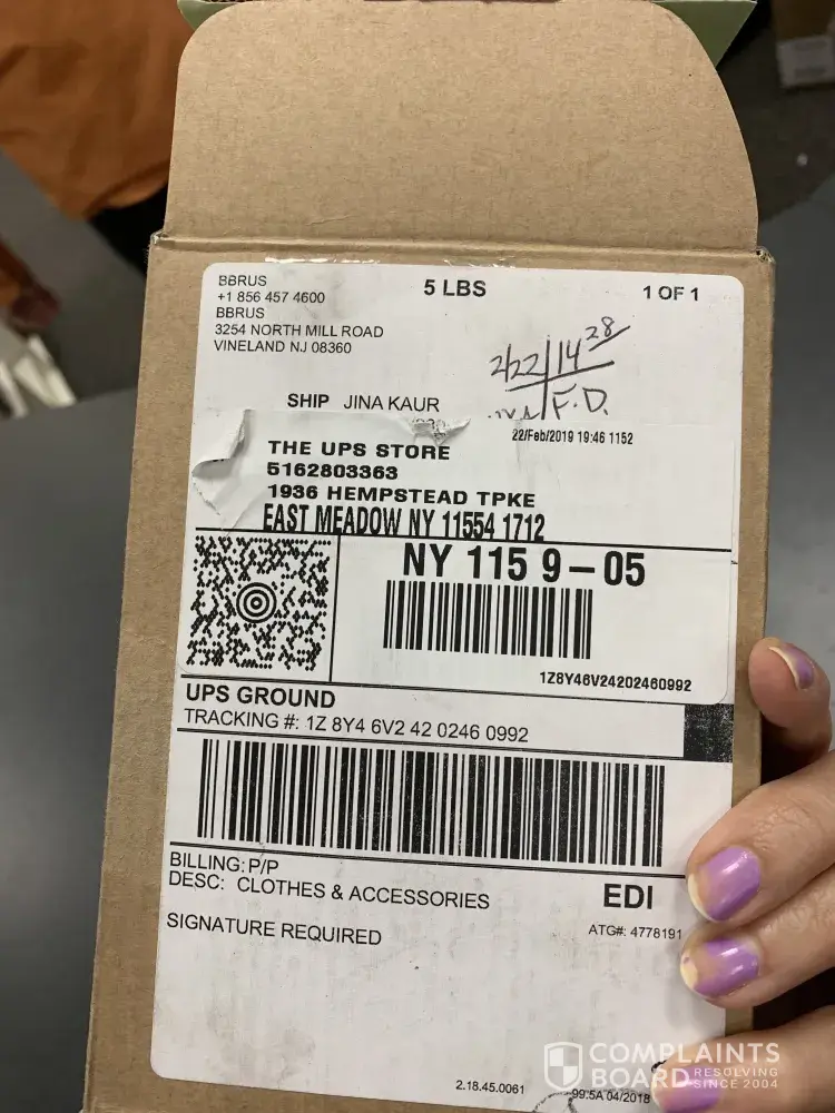 "please be advised that jina kaur will receive a refund of $95 + tax = $103.20 for the shipment received on 2/25/2019 tracking #1z8y46v24202460992 from bbrus. The package was inadvertently given to the wrong customer, then returned empty" - followed by his name, sign and address of the store "russell cohen, the ups store east meadow, ny 11554, and 516-280-3363"